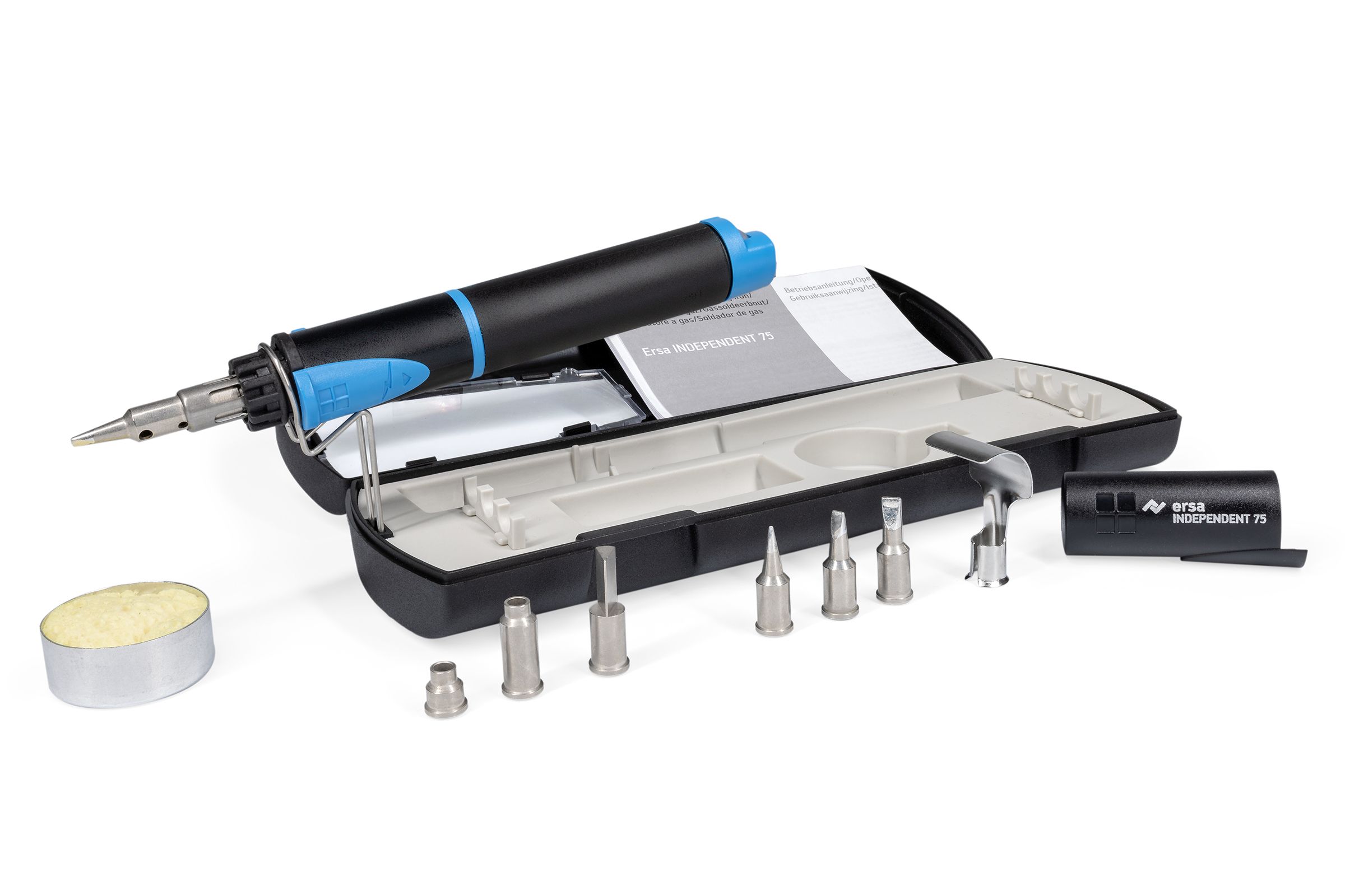 Im Independent 75 “Profi Set” enthalten ist ein Gaslötkolben mit montierter Lötspitze (0G072KN), 2,4 mm vernickelt meißelförmig, drei weitere Lötspitzen, ein Glühmesser zum Formen und Schneiden von Hartschaumstoffen, eine Heißgasdüse und ein Reklektorblech zur Verarbeitung von Schrumpfschläuchen und zum Löten von SMD-Komponenten, eine Flammdüse zum Mikroschweißen sowie ein Schwammbehälter mit Reinigungsschwamm (0006G) und einem Ablagebügel (0A20).
