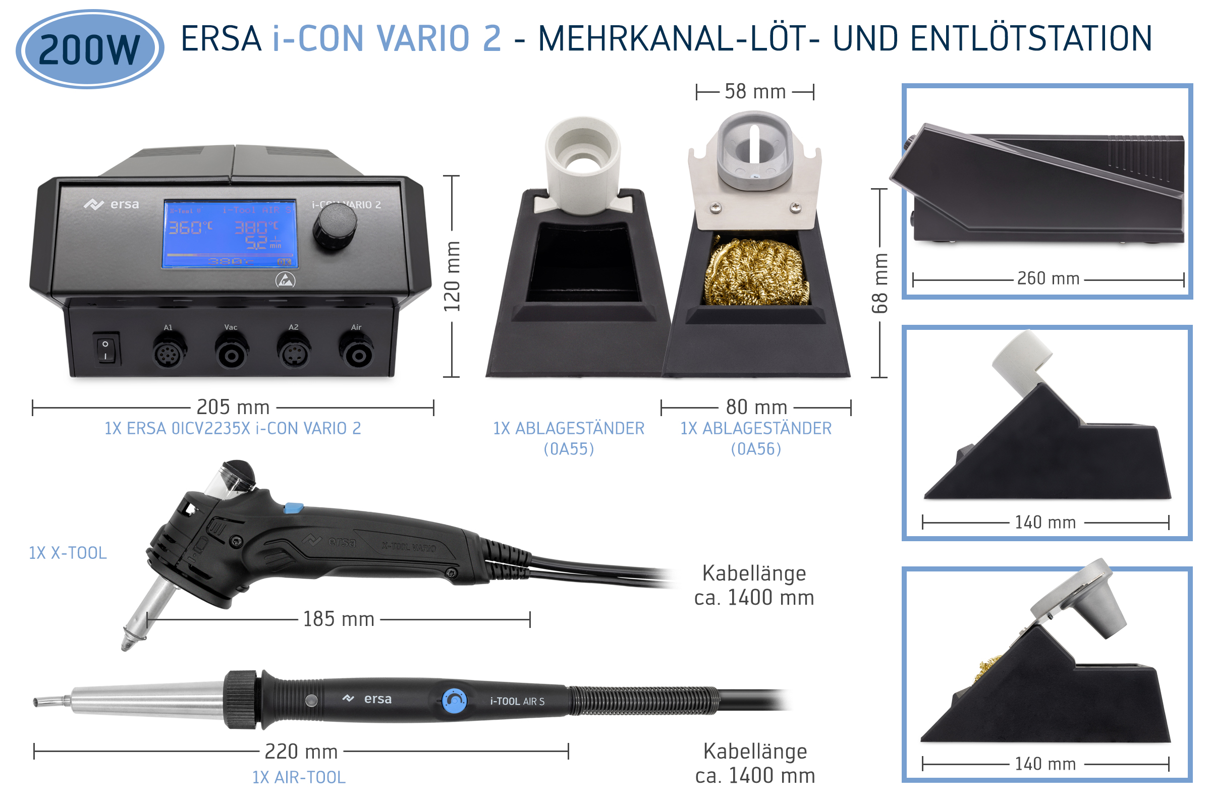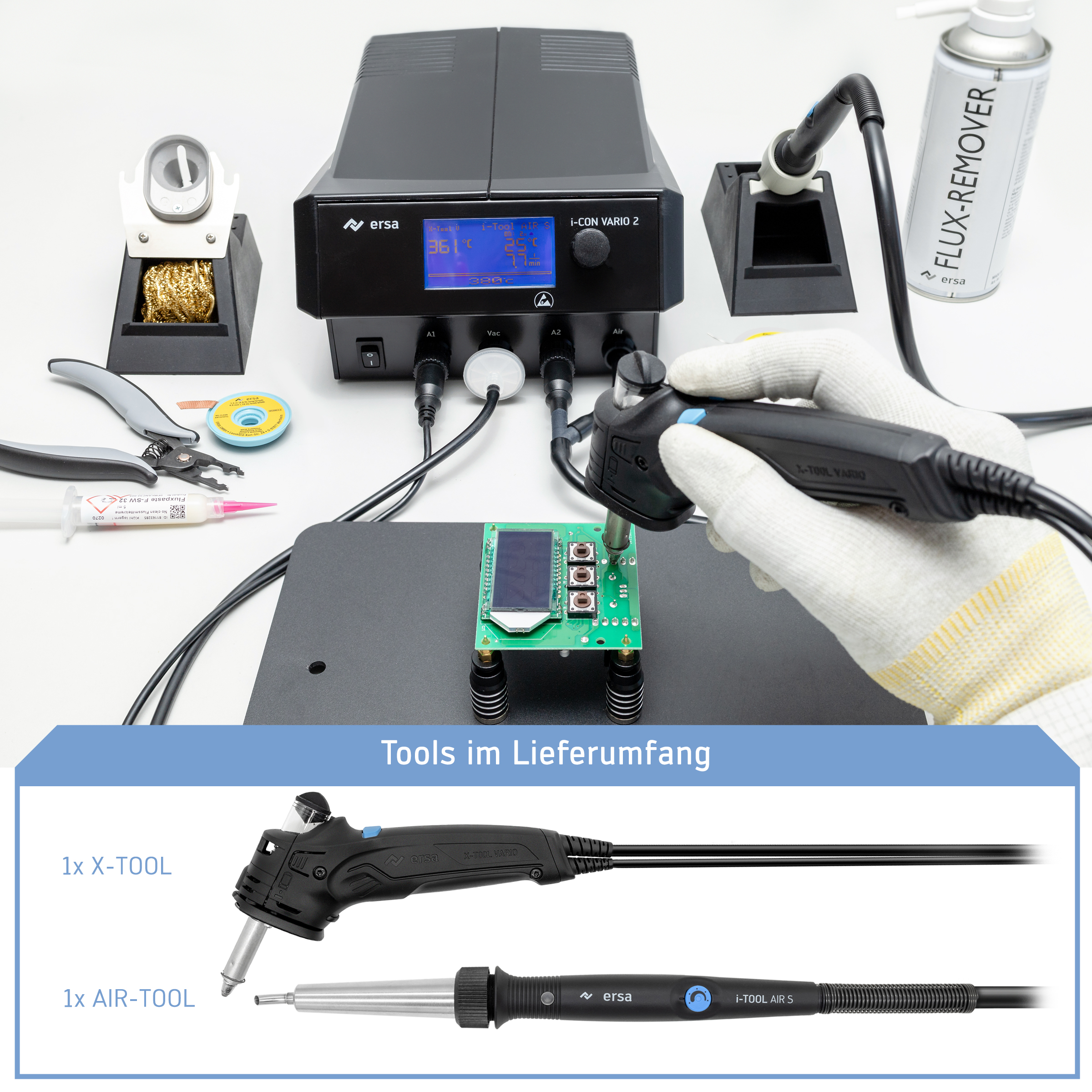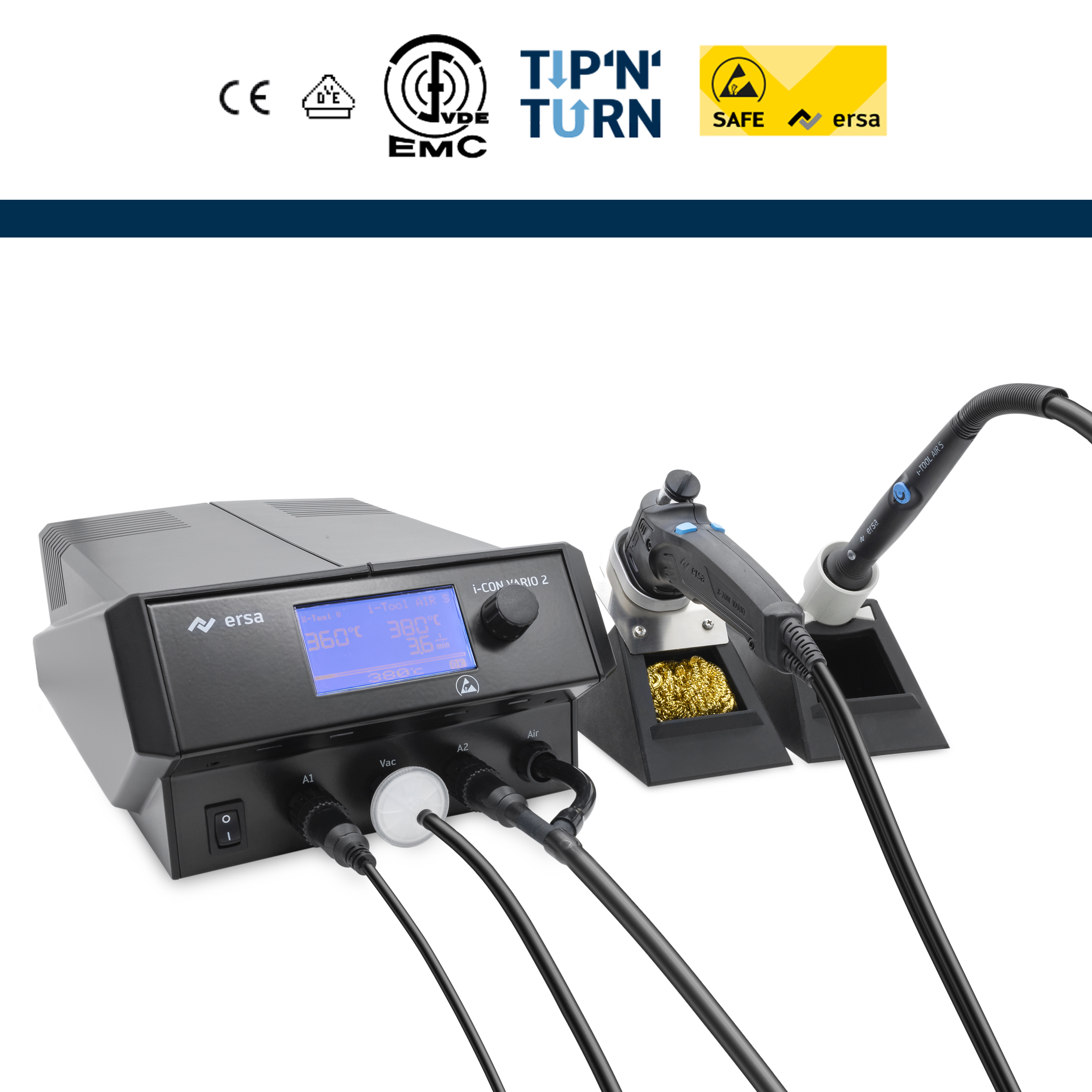 The i-CON VARIO 2 MK2 multi-channel soldering and desoldering station meets the highest demands of professional soldering and desoldering. 2 ERSA tools can be operated simultaneously with hot air and vacuum.