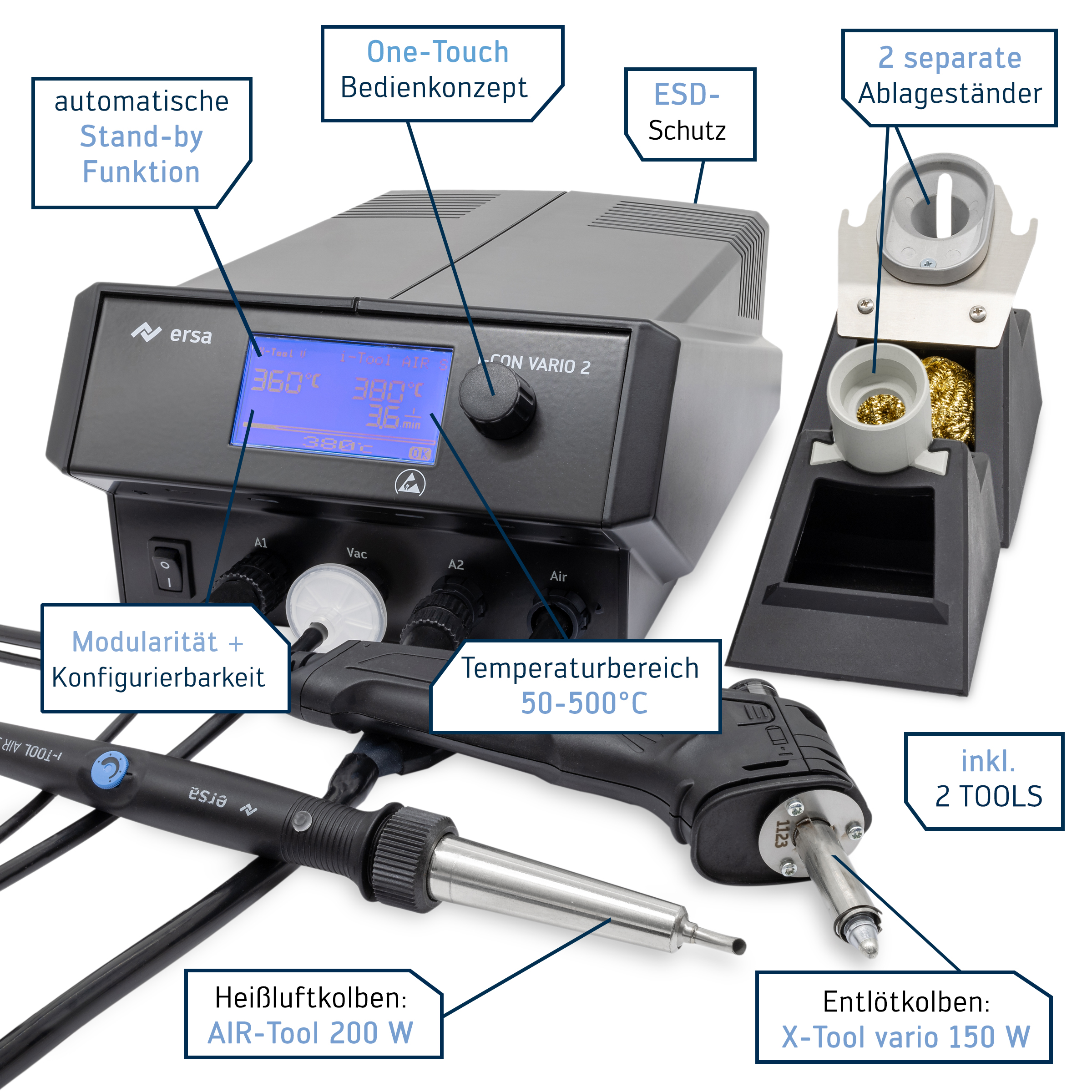 ERSA VARIO2 MK2, ESD 2-channel soldering and hot air station with X-TOOL vario 150W & AIR-TOOL 200W, auto-standby