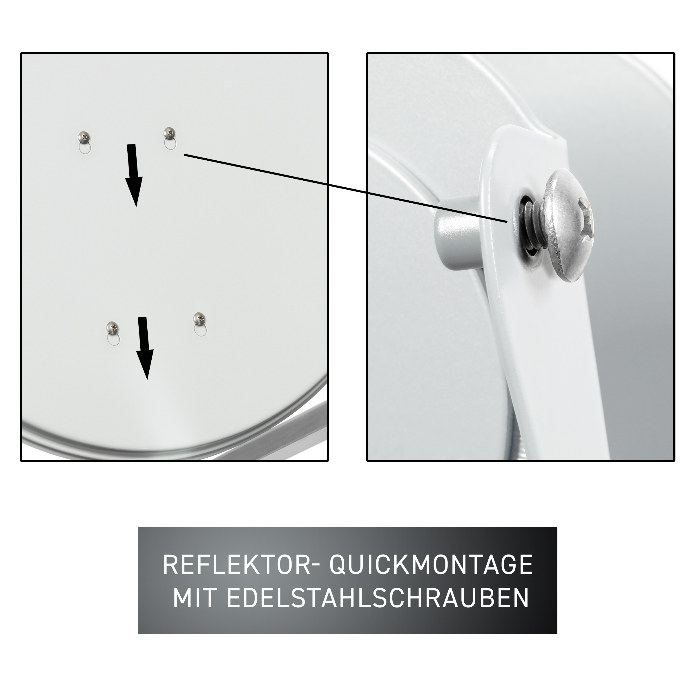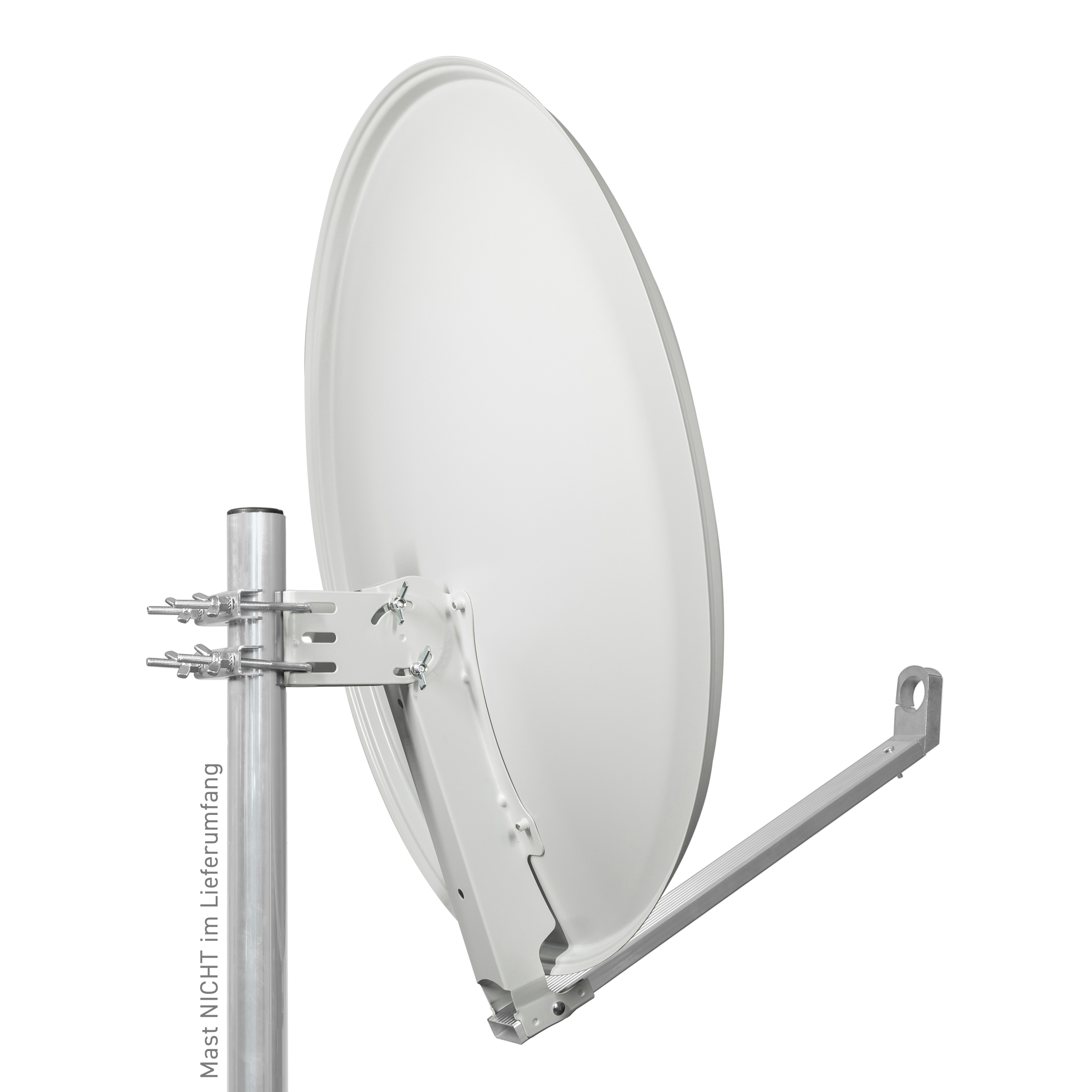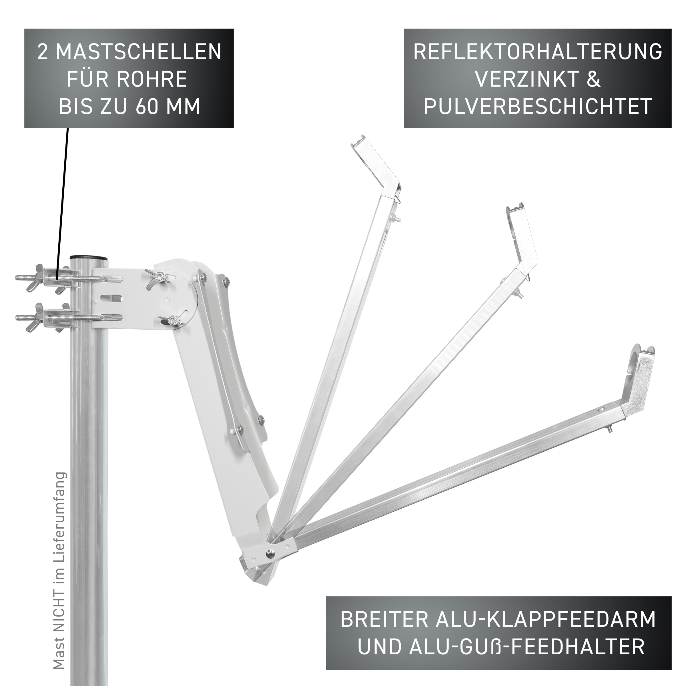 with reflector bracket made of galvanized sheet steel, additionally plastic-coated, with wide ALU folding feed arm and ALU cast feed holder, 2x mast clamp with wing nuts, reflector quick-mounting with stainless steel screws