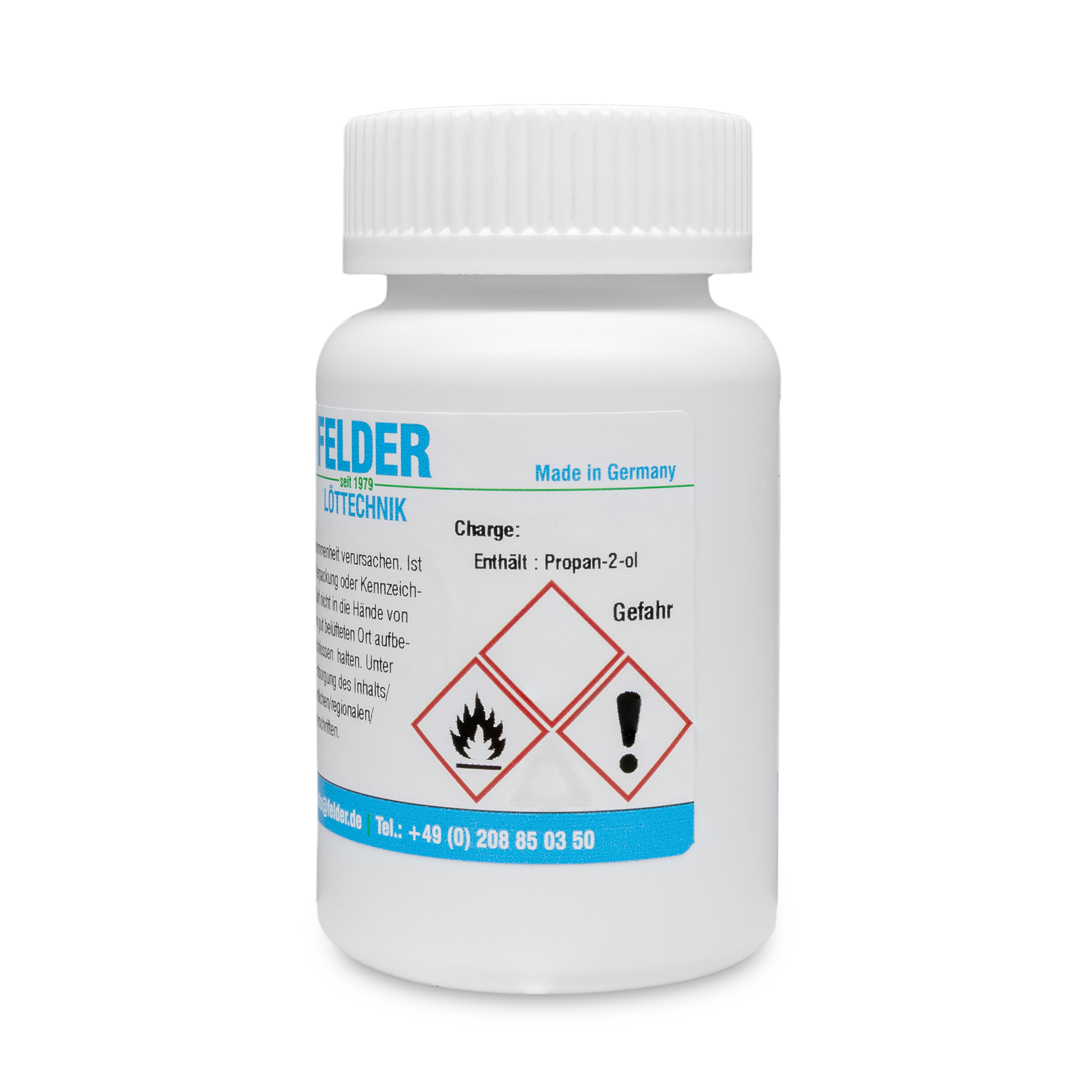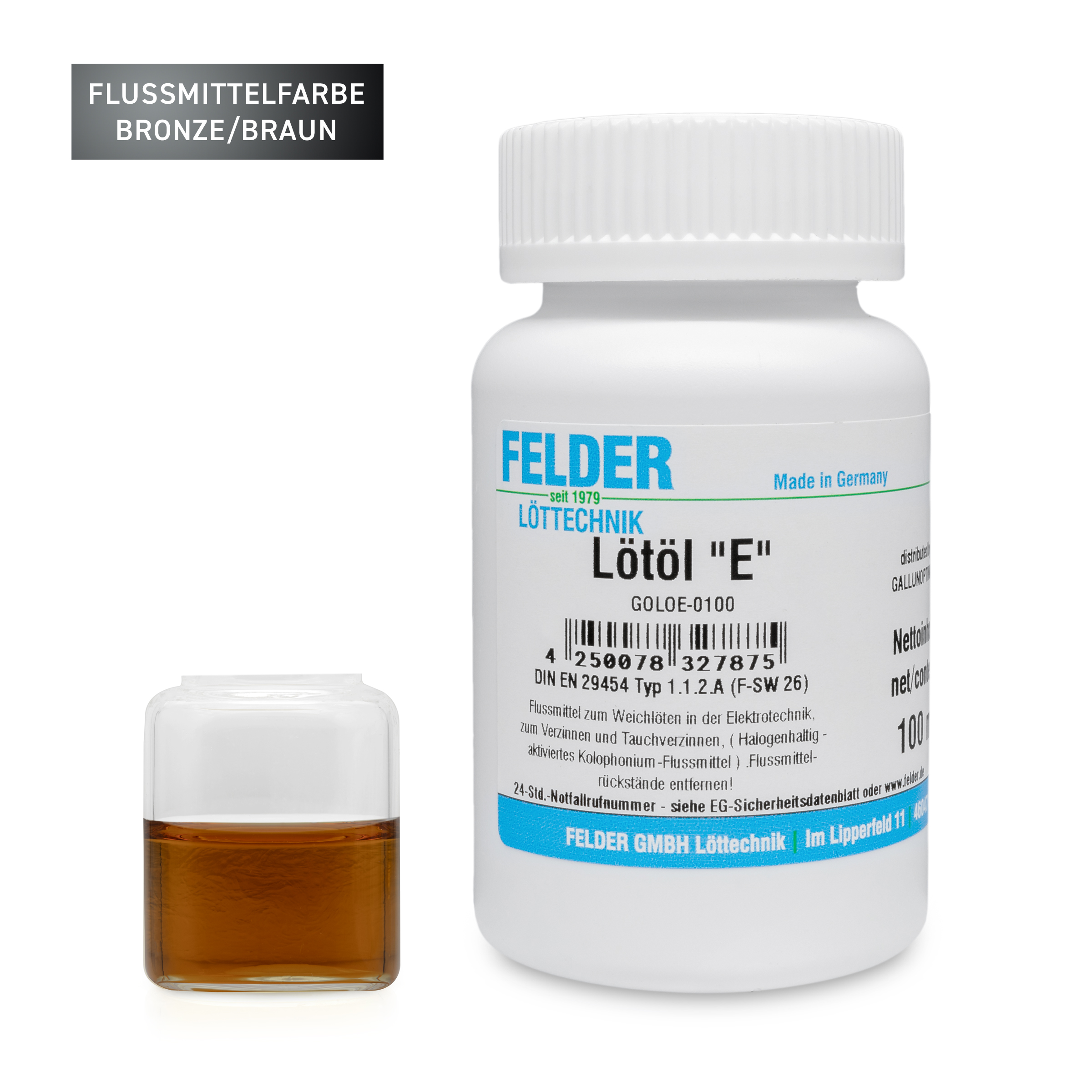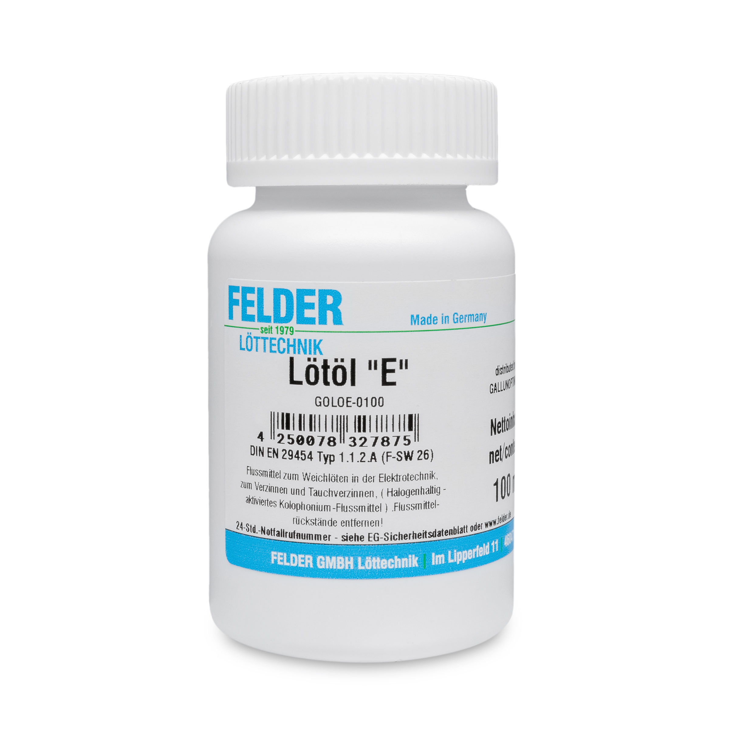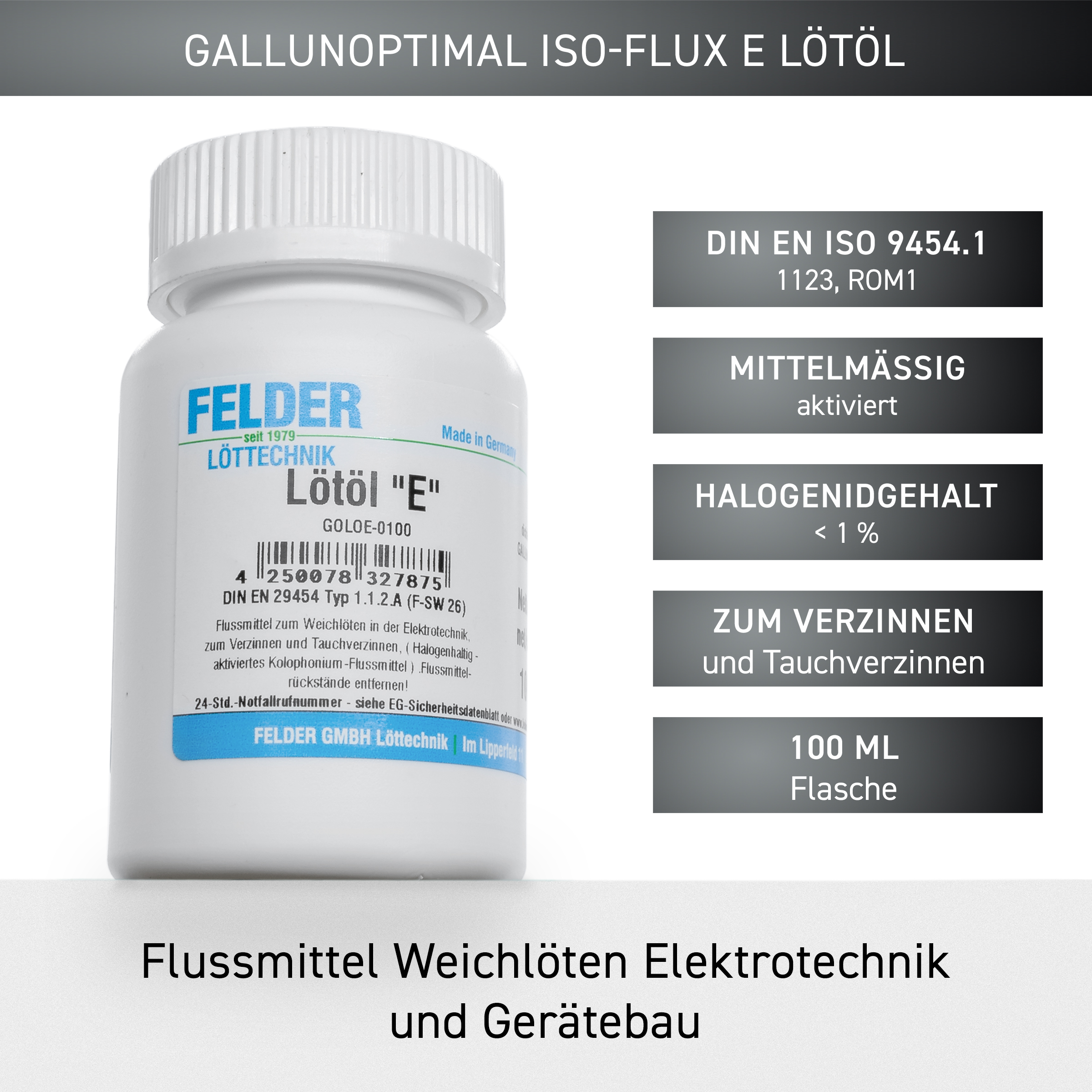 ISO-Flux E Soldering oil Flux Soldering in electrical engineering and tool manufacturing. Very suitable for soldering and tinning work that needs to be carried out at high soldering temperatures and for long soldering times. The formation of solder bumps is completely prevented by this flux. The flux residues are non-corrosive. Moderately activated, DIN EN ISO 9454-1 1123, ROM1, halide content < 1%, 100ml bottle
