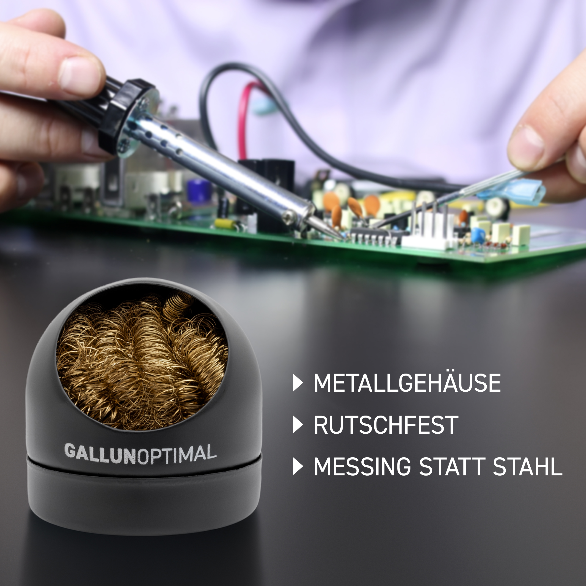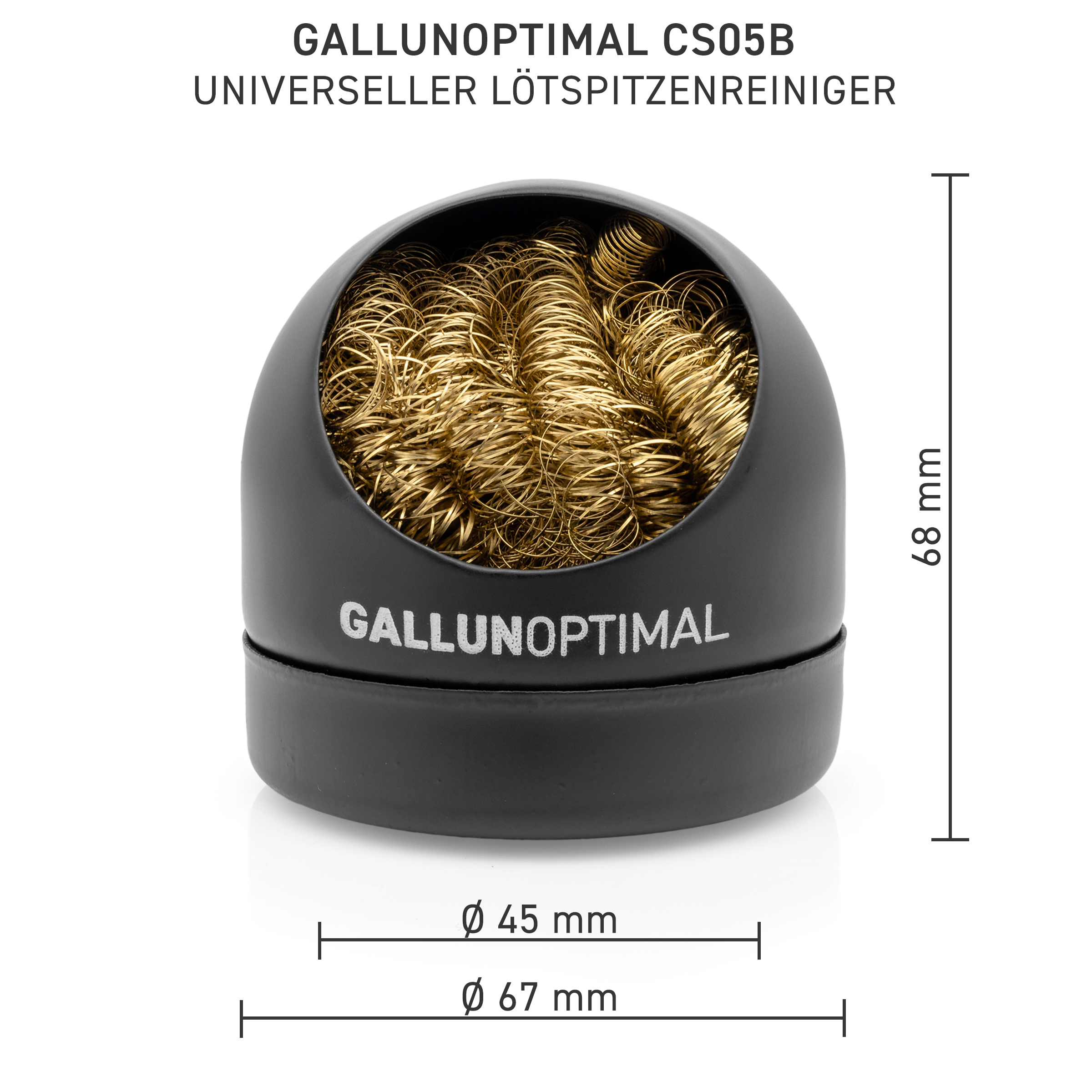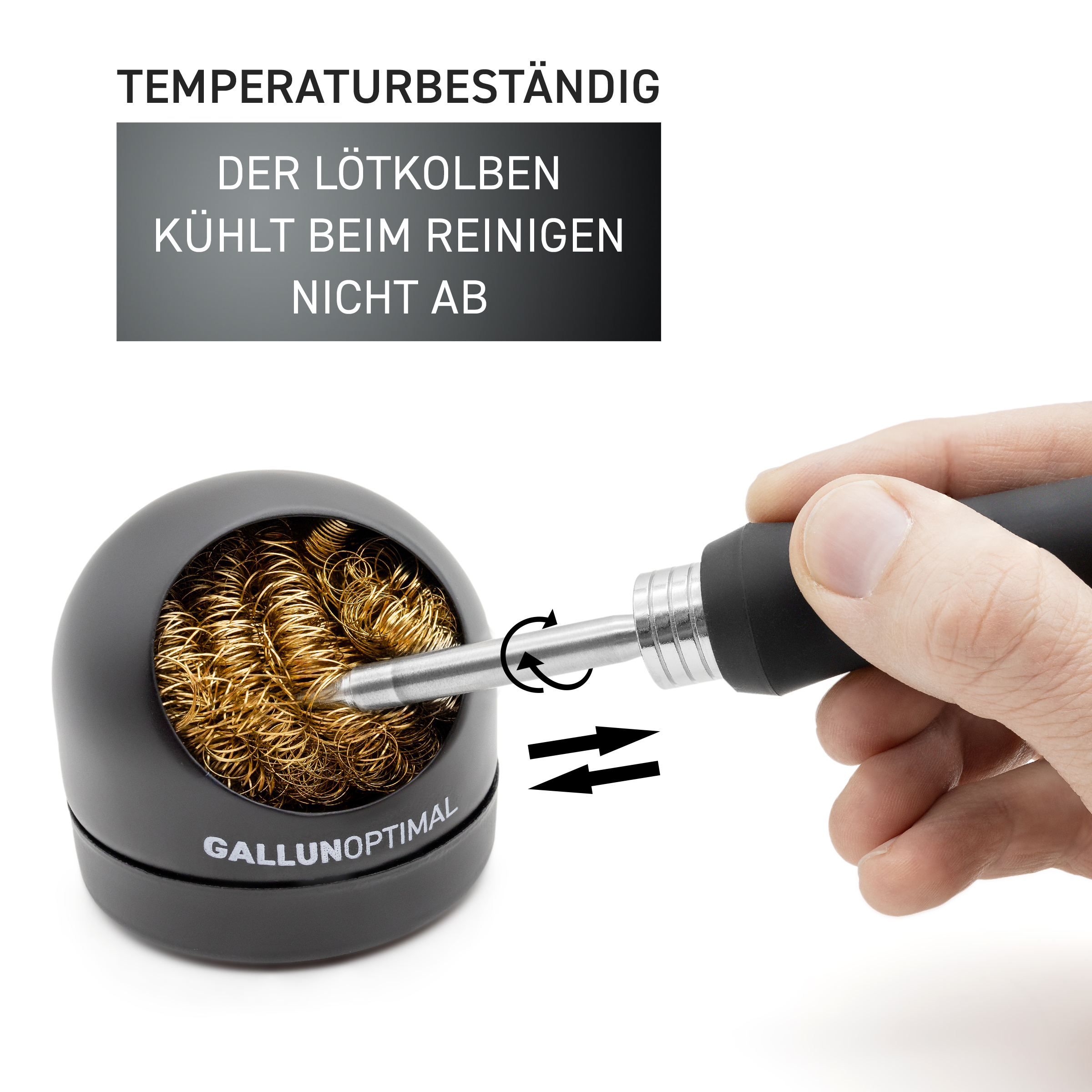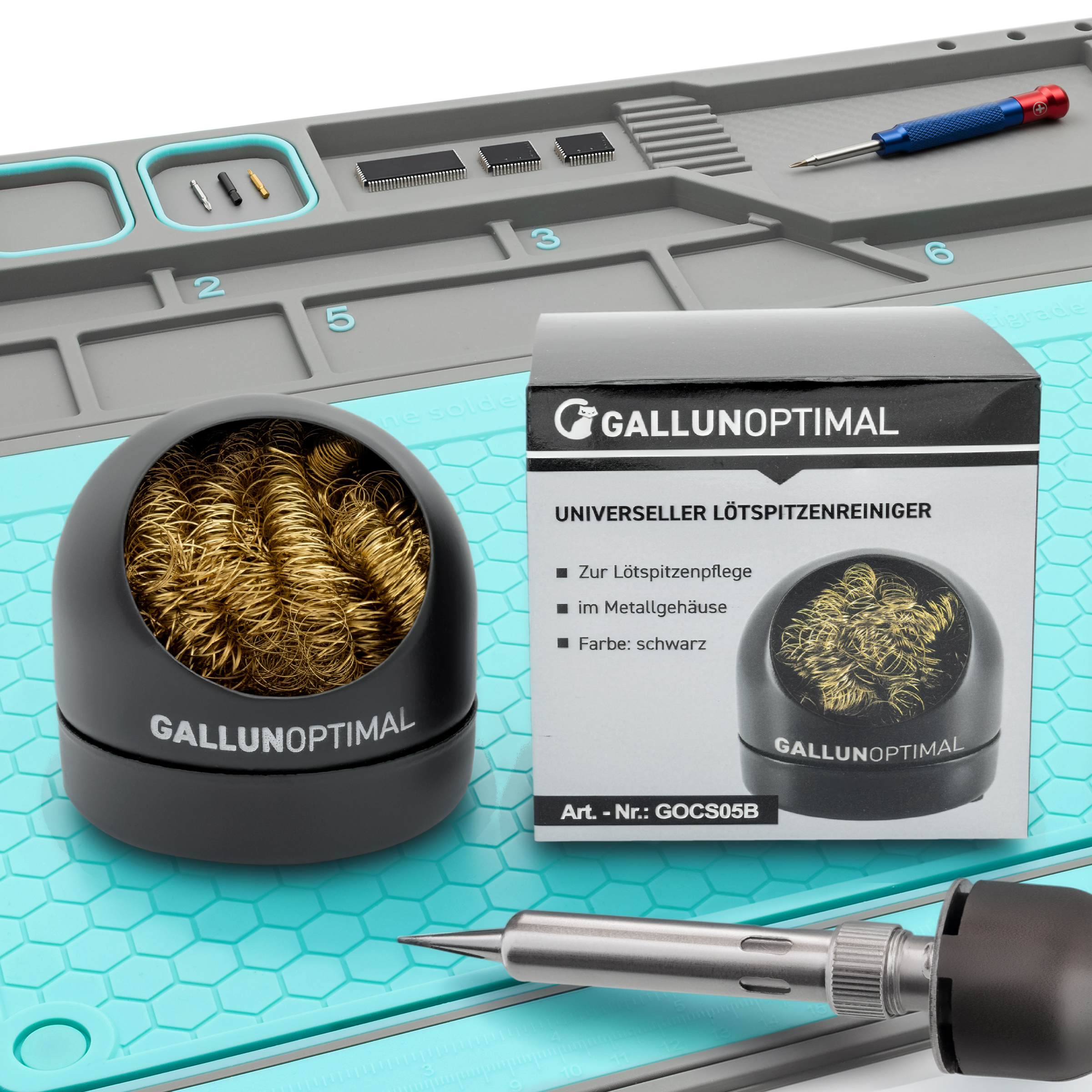 GALLUNOPTIMAL universal soldering tip cleaner with metal wool for soldering tip care in a metal housing, black