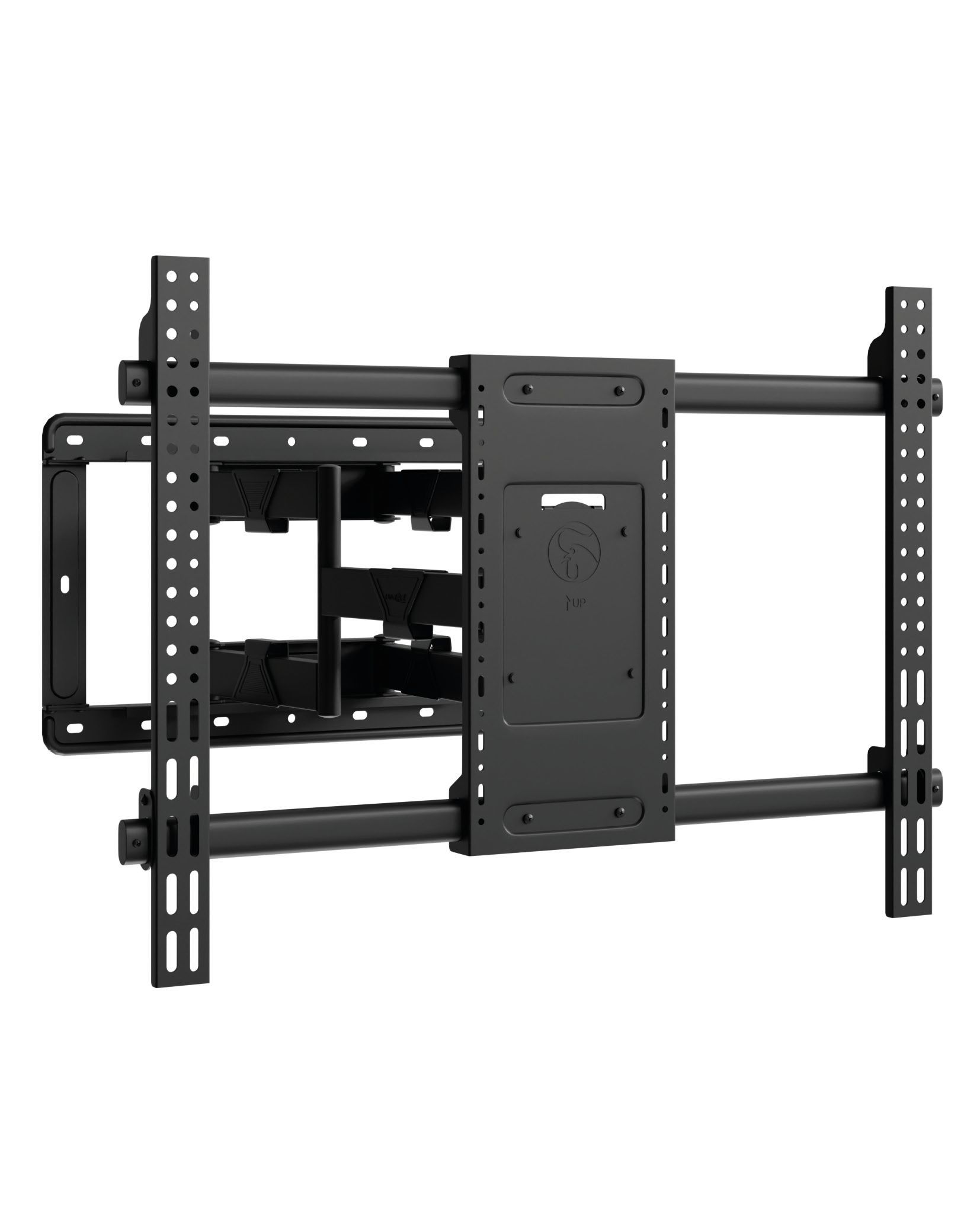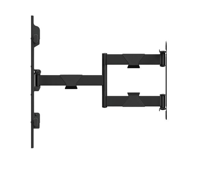 The mount also allows for post-installation leveling of ±2°. The distance from the wall can be adjusted using the extension arm from a minimum of 50 mm to a maximum of 648 mm. Cables are routed along the support arms using cable clips. This ensures that cables are neatly routed and do not interfere when the mount is moved. The maximum load capacity is 80 kg.
