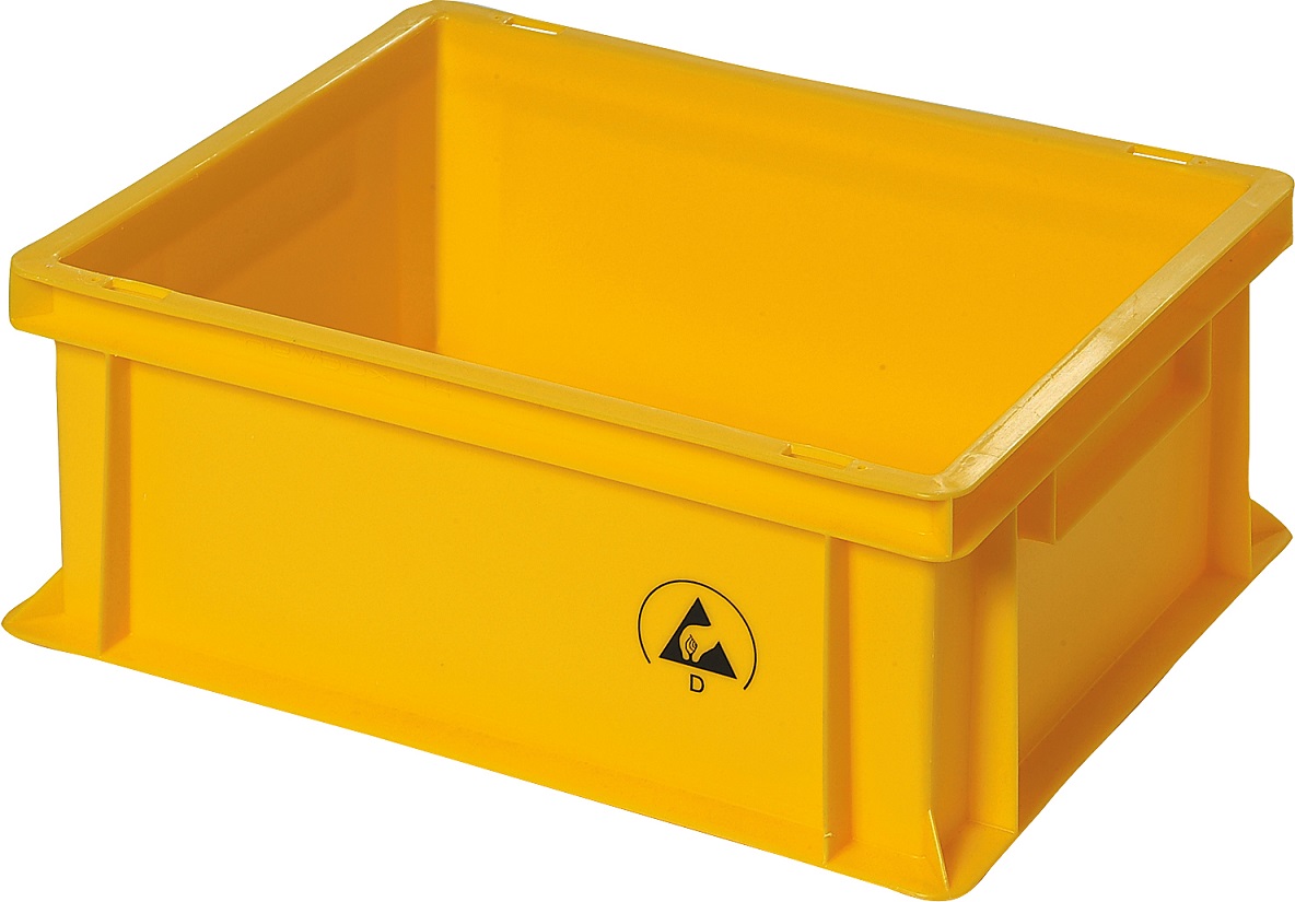 Durch das Paletten-/Euro-Modulmaß 400 × 300 mm passt der Behälter in viele gängige Lager- und Logistiksysteme. Er ist stapelbar und trägt eine ESD-Kennzeichnung zur eindeutigen Zuordnung im Betrieb.
