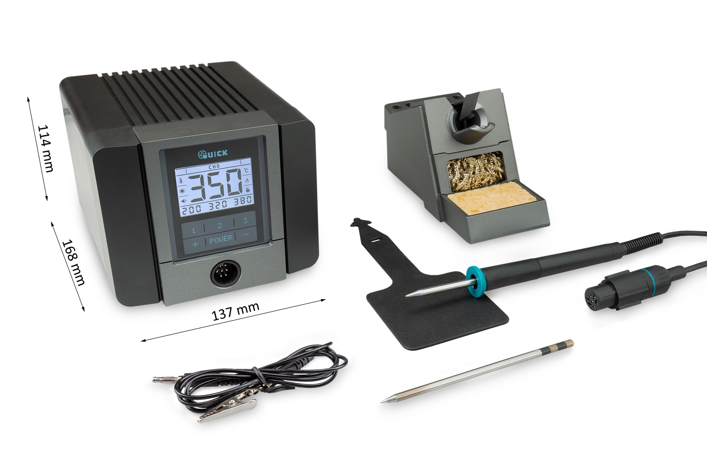 Digitale Lötstation QUICK TS1200D mit LCD-Display, Auto-Standby, kalibrierbar, ESD-Test-Funktion und 3 Temperaturspeicher, 200-420°C. Dank prozessor- und sensorgesteuerter Temperaturregelung und hoher Leistungsreserven wird die Soll-Temperatur sehr schnell erreicht (350°C in 7 sek.) und stabil gehalten. Somit ist die Station bestens zum bleifreien Löten geeignet.