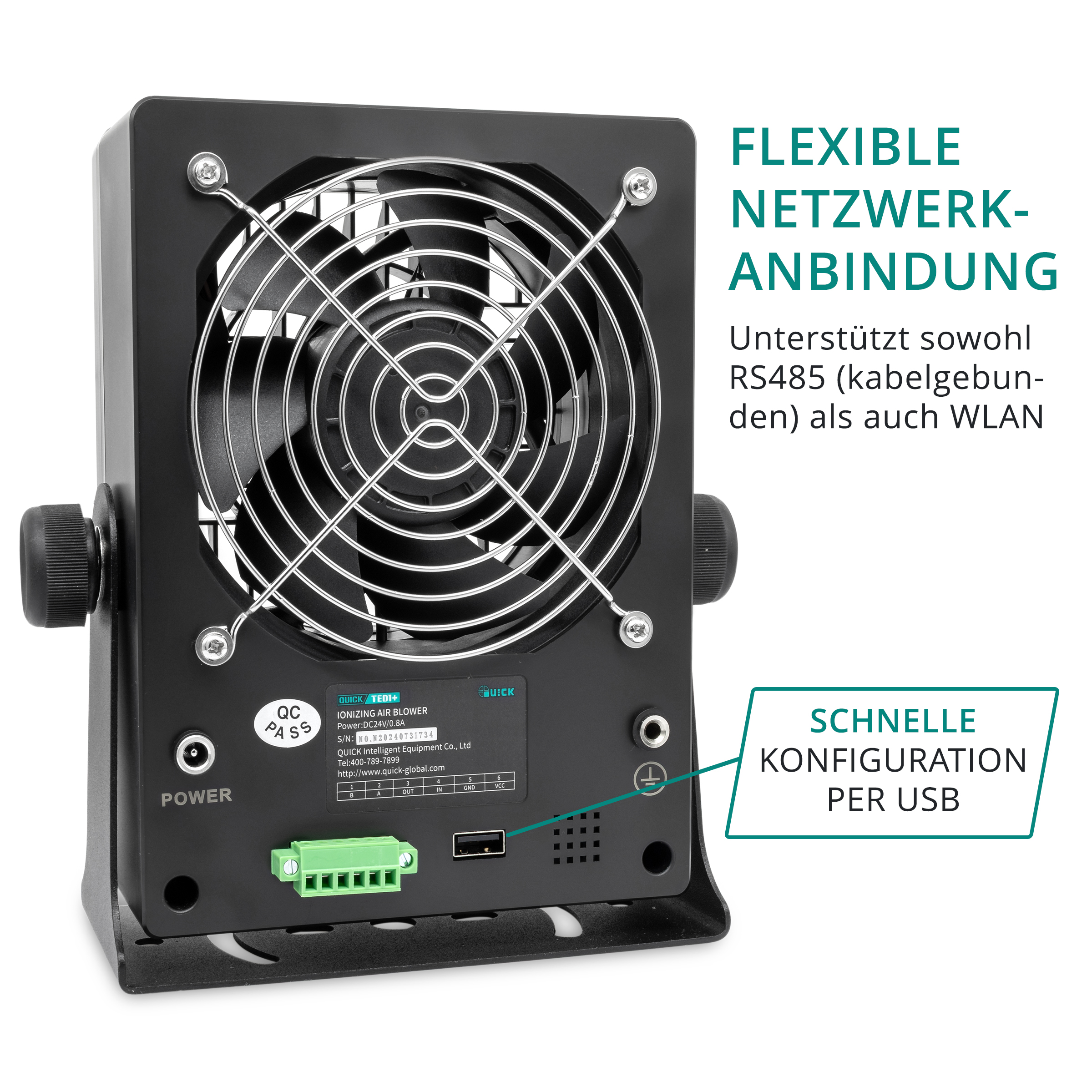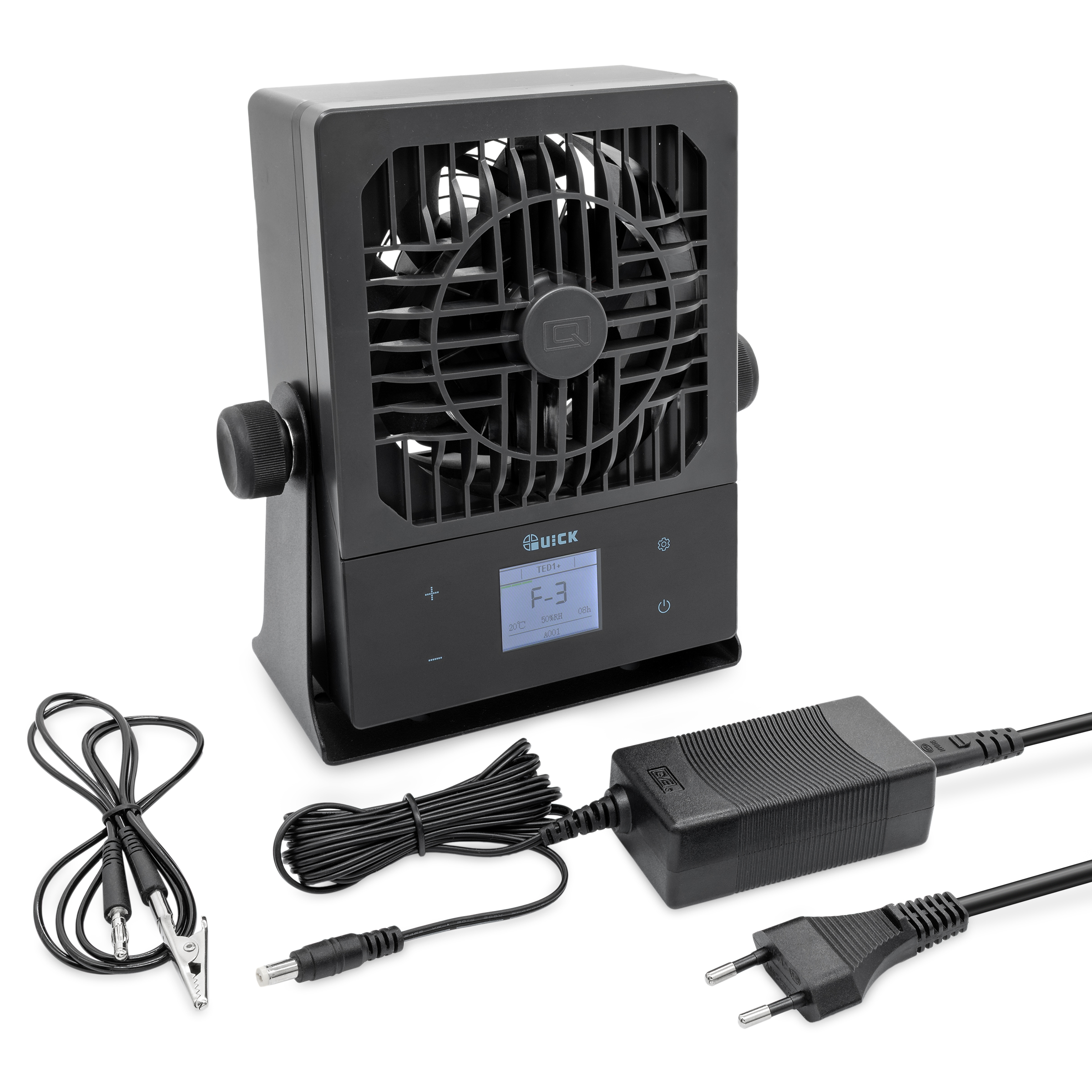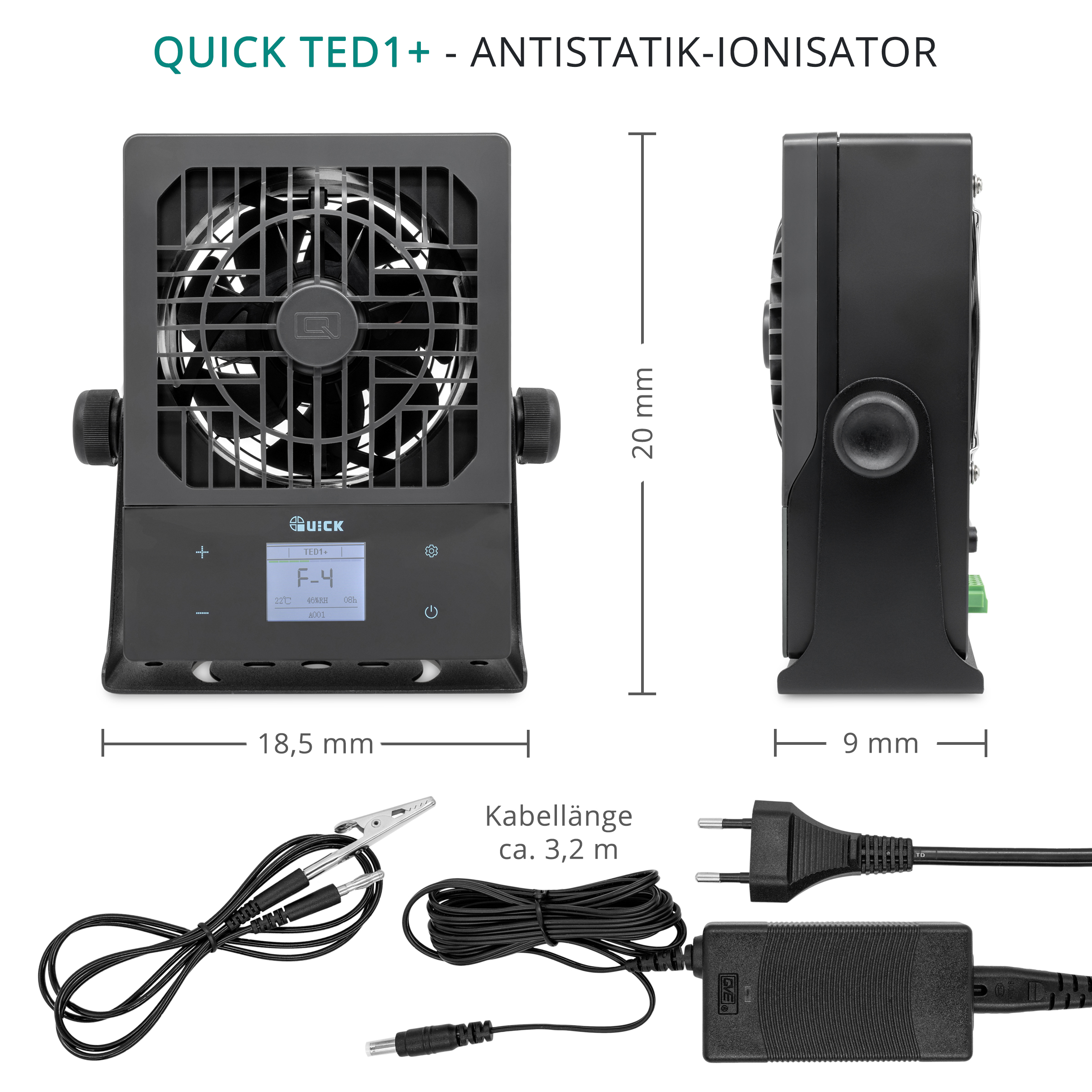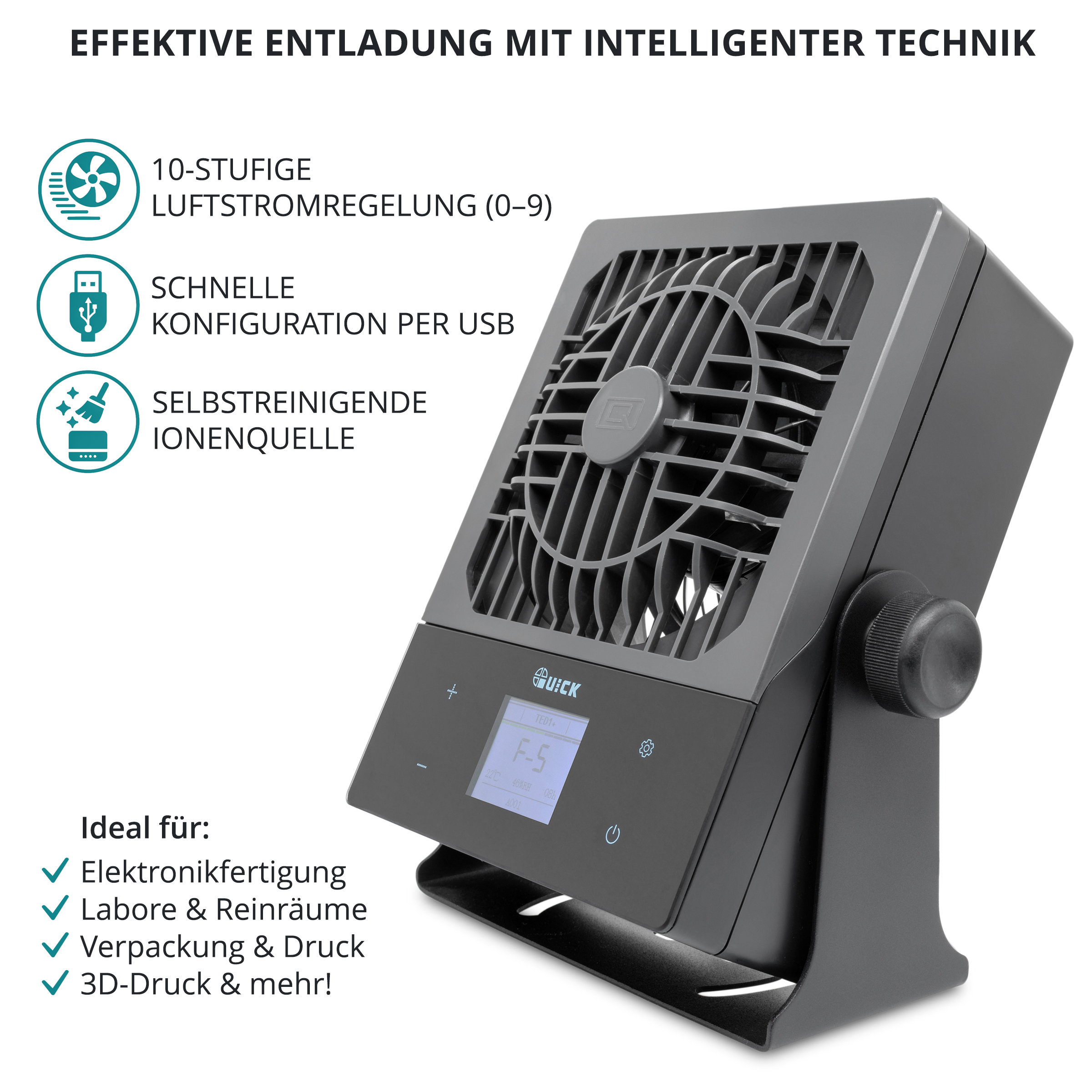 The QUICK TED1 ionization fan is a compact static eliminator for ESD-sensitive workplaces and is useful wherever disruptive electrostatic charges build up due to air movement, friction, or the handling of plastics and circuit boards. It generates targeted positive and negative ions, thereby neutralizing static charges in the work area – ideal for assembly, repair, rework, visual inspection, packaging, and handling of sensitive electronic components.