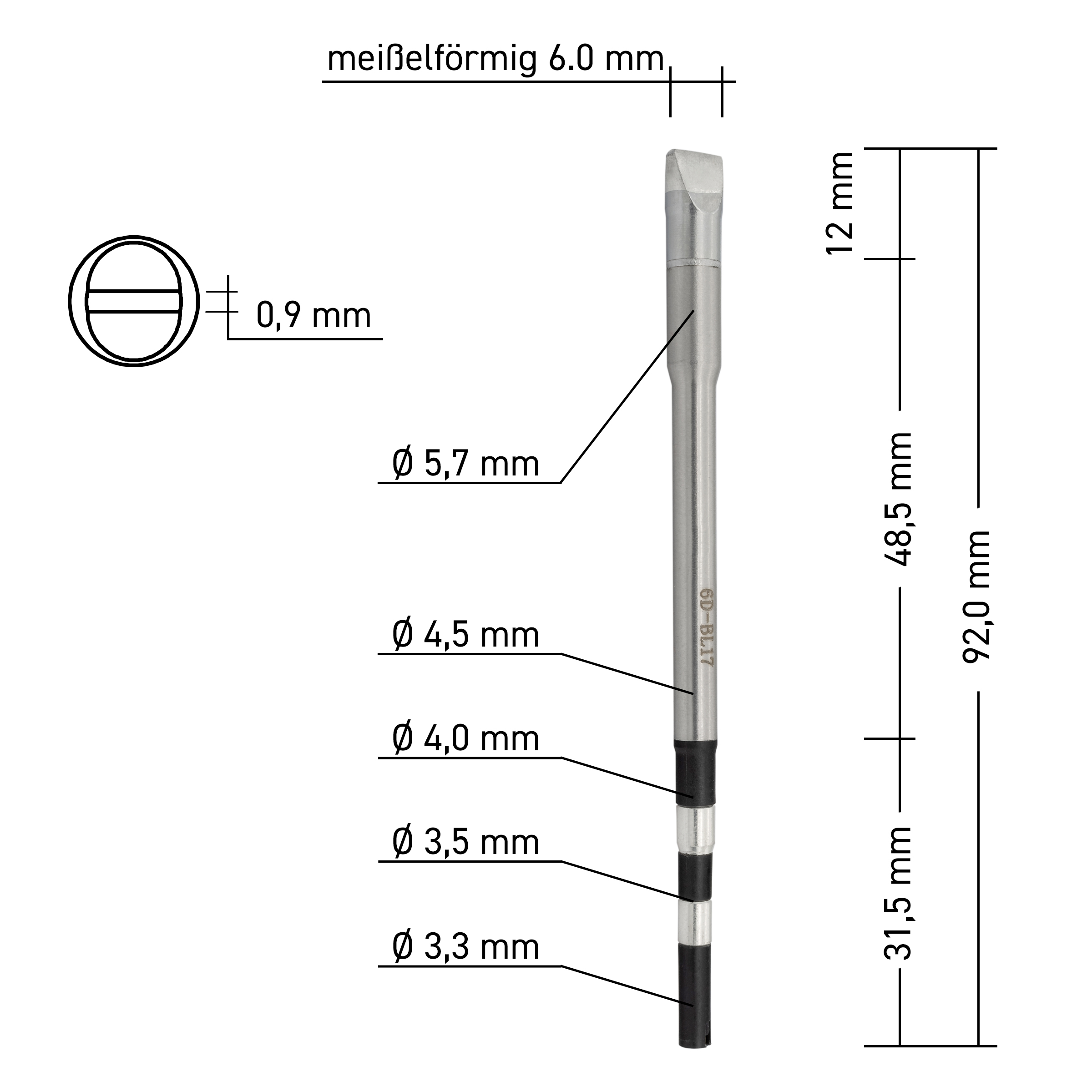 QUICK Kartuschenlötspitze für TS8, gerade, kurzer Kegel, meißelförmig stumpf 6 mm breit x 0,9 mm, 5 mm Lot-benetzt