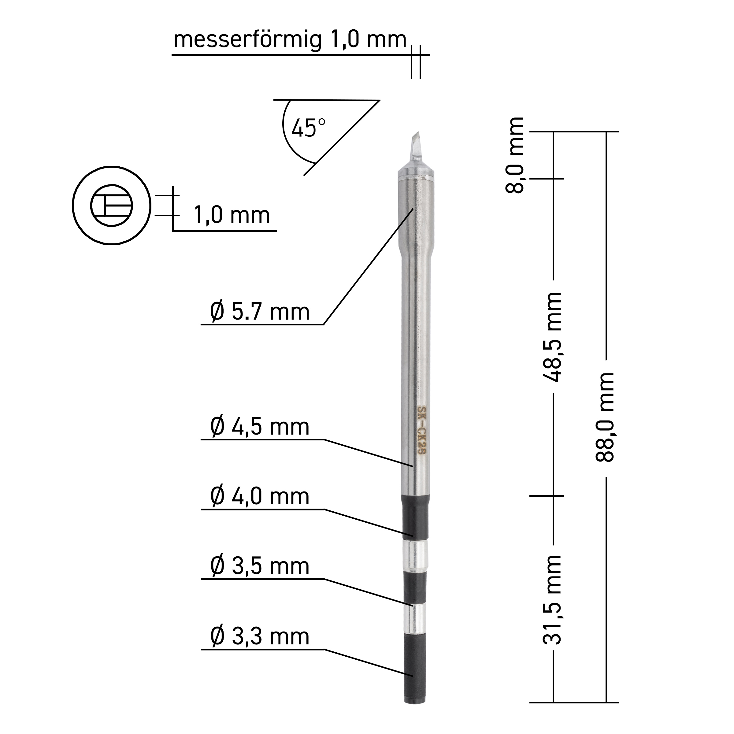 Spitzenform: messerförmig R0.1, angeschrägt 45°