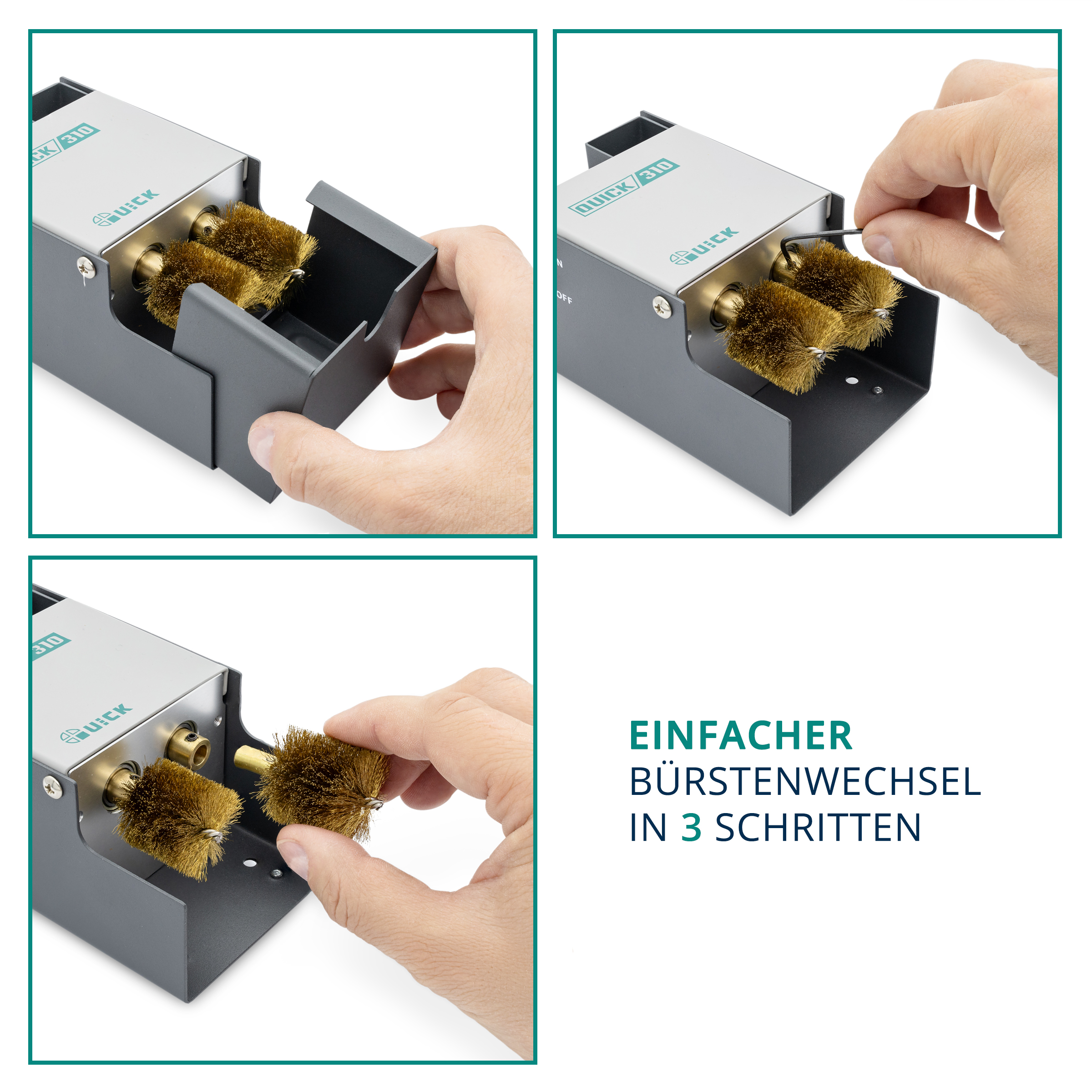 Die hochwertigen Messingbürsten des QUICK 310 entfernen mühelos Rückstände und Oxidationen, die beim Löten entstehen. Innerhalb weniger Sekunden wird die Lötspitze gründlich gereinigt und ist sofort einsatzbereit. Diese effektive Reinigung optimiert die Wärmeübertragung und verbessert die Qualität Ihrer Lötstellen. Eine regelmäßige Anwendung kann die Lebensdauer der Lötspitzen im Vergleich zur manuellen Reinigung sogar verdoppeln.