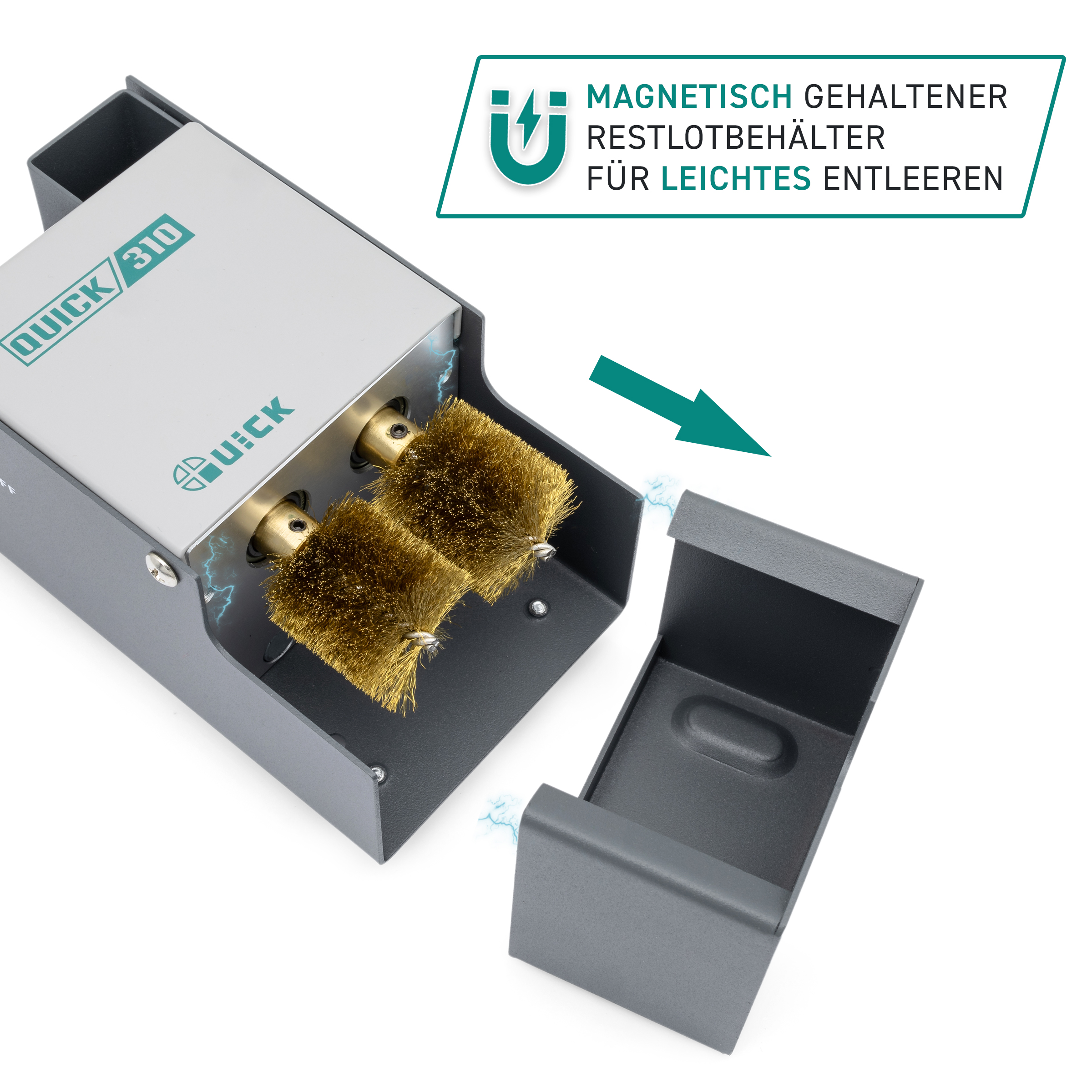 Das kompakte Gerät ist mit einer magnetisch befestigten Auffangschale ausgestattet, die Lotreste sicher sammelt und sich einfach entleeren lässt. So bleibt Ihr Arbeitsplatz sauber und aufgeräumt. Dank seines platzsparenden Designs ist der QUICK 310 sowohl für den Einsatz in professionellen Werkstätten als auch im heimischen Hobbyraum ideal geeignet.