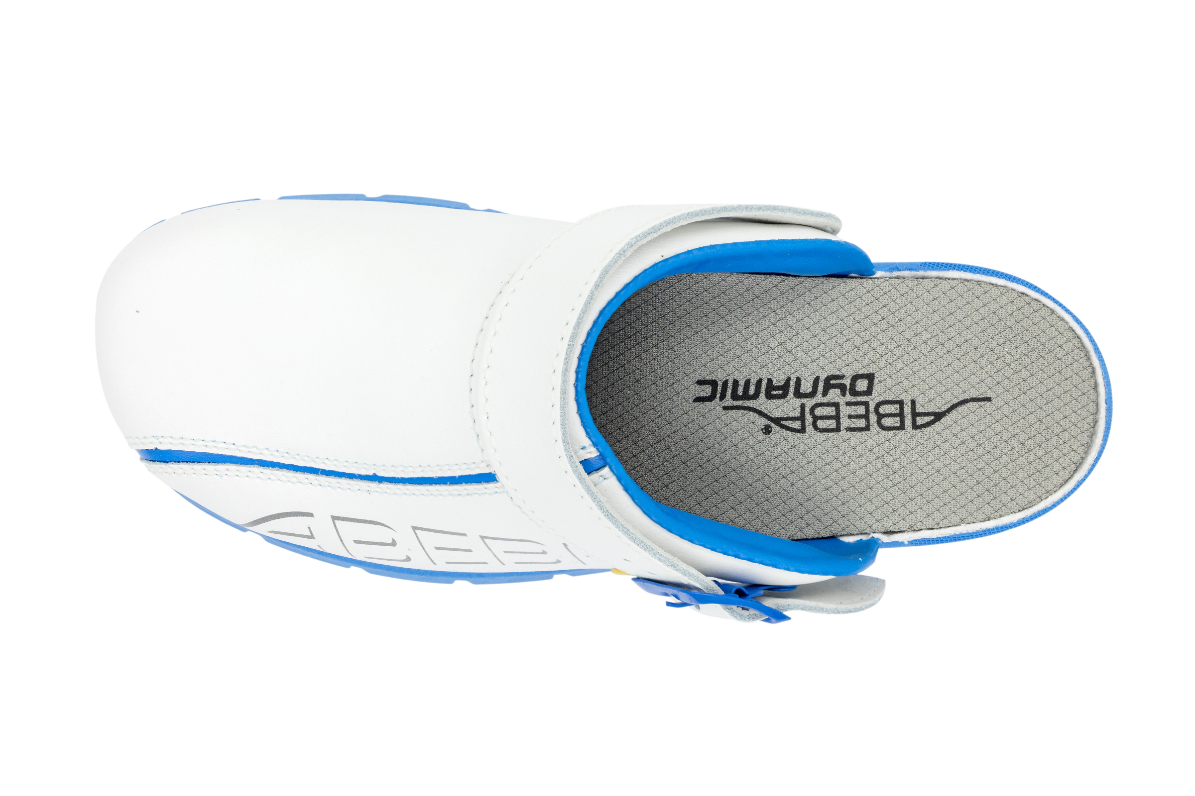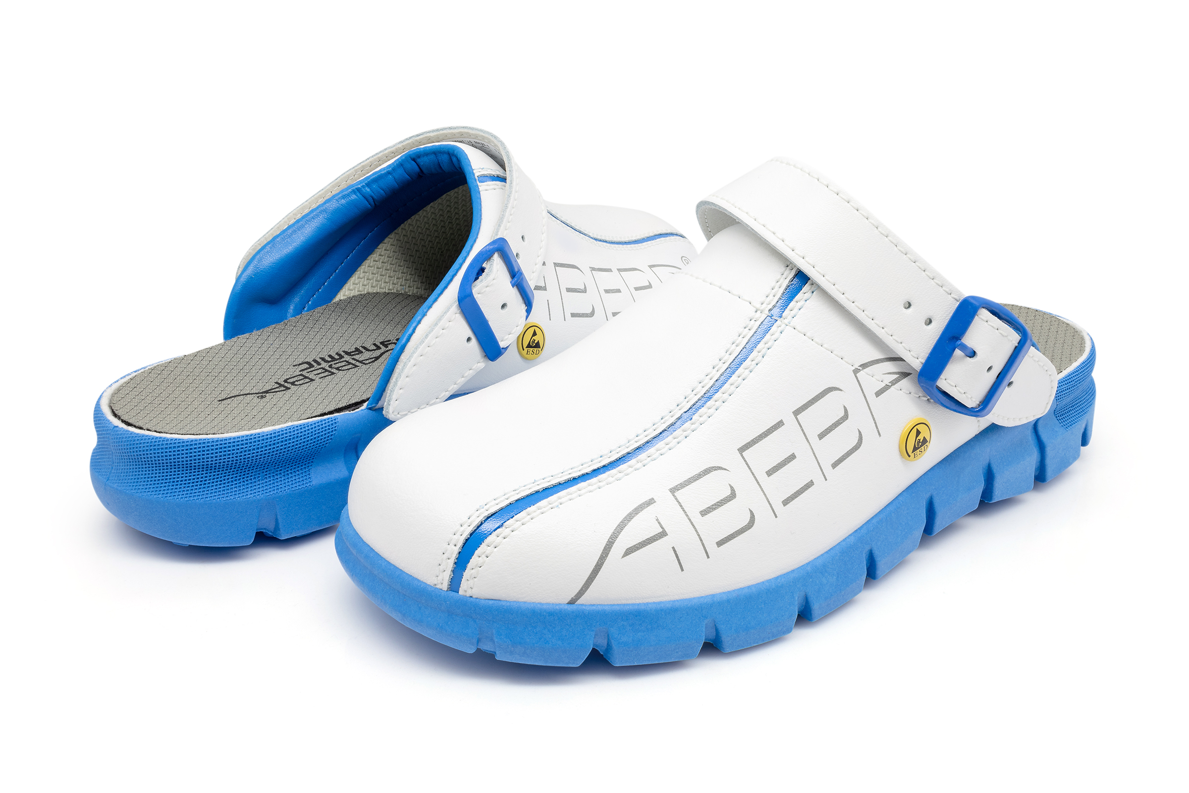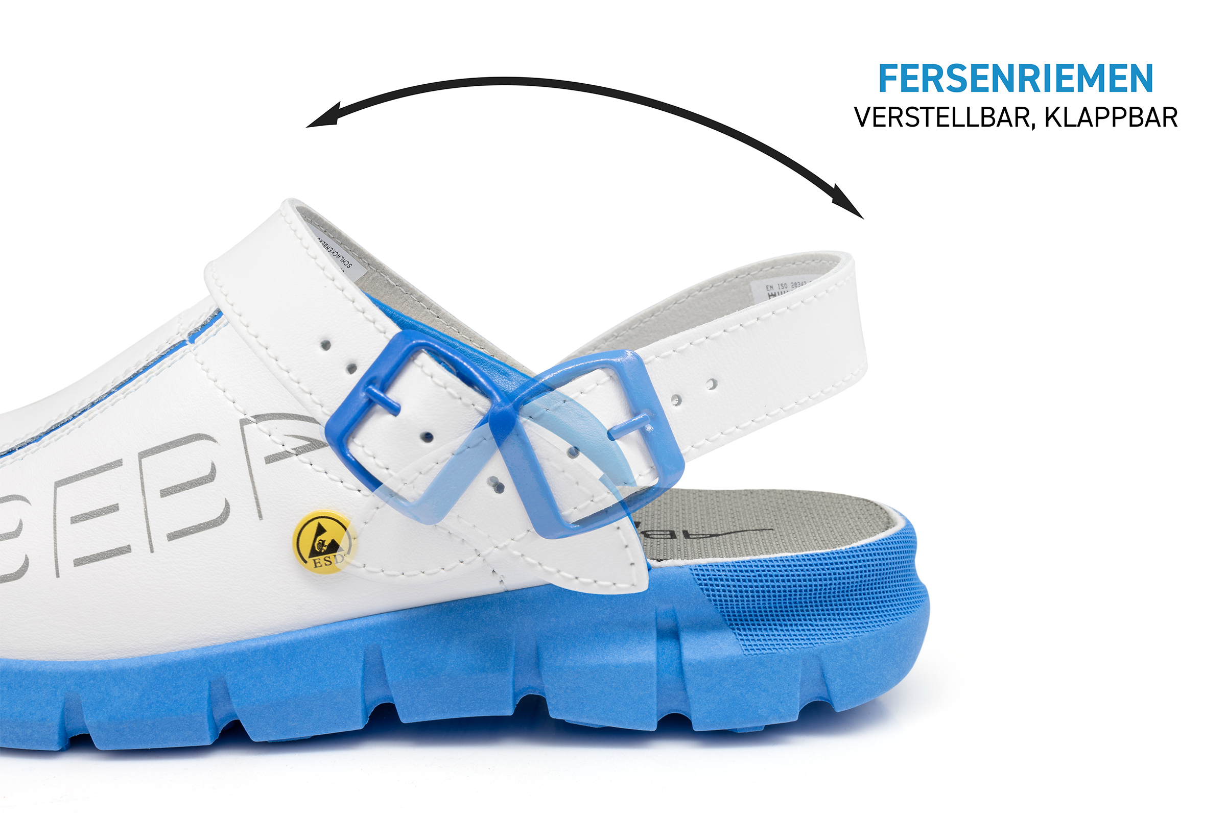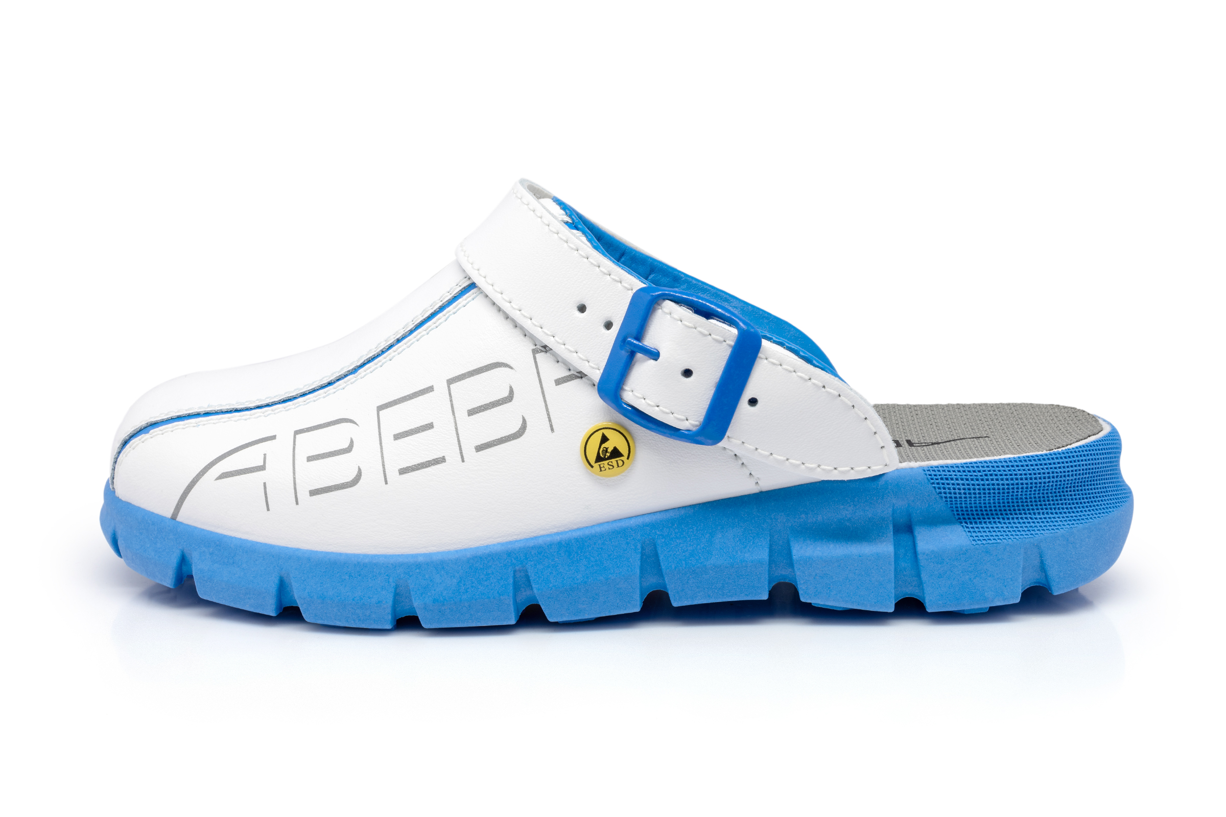 ABEBA ESD-Berufsschuh Dynamic, Clog weiß/ blau mit Aufdruck ESD, ESD-gerecht nach DIN EN 61340, Größe 36, Fersenriemen klappbar, verstellbar, Sicherheitsklasse: OB, auswechselbare acc Wave Einlegesohle (Art. 3574), ORTHOstat Sohle möglich, Sanitized behandelt, Dynamic B ESD Laufsohle blau, Rutschhemmende TPU-Laufsohle, Obermaterial: Glattleder, geeignet für: Damen / Herren, Fersenriemen verstellbar