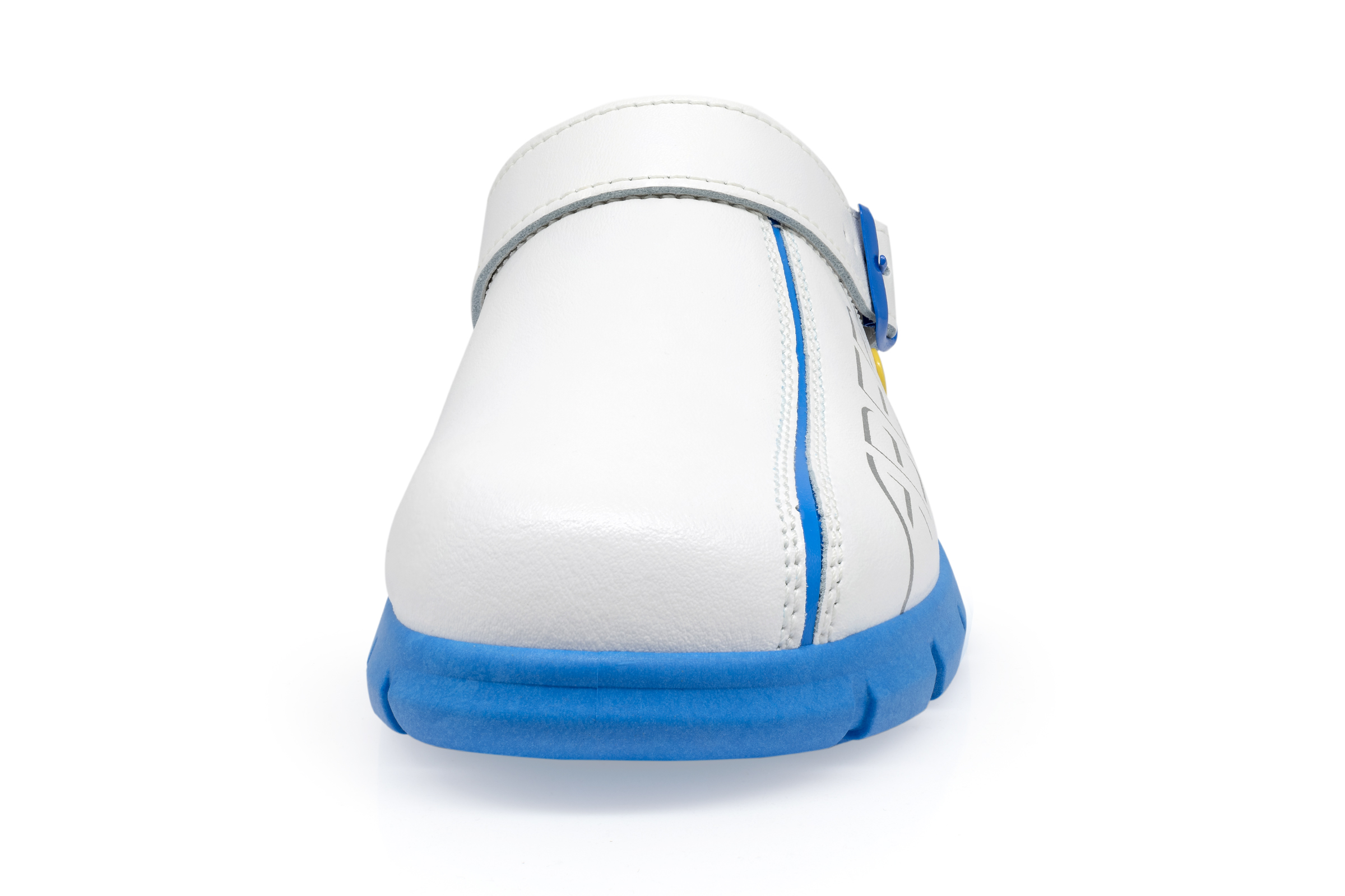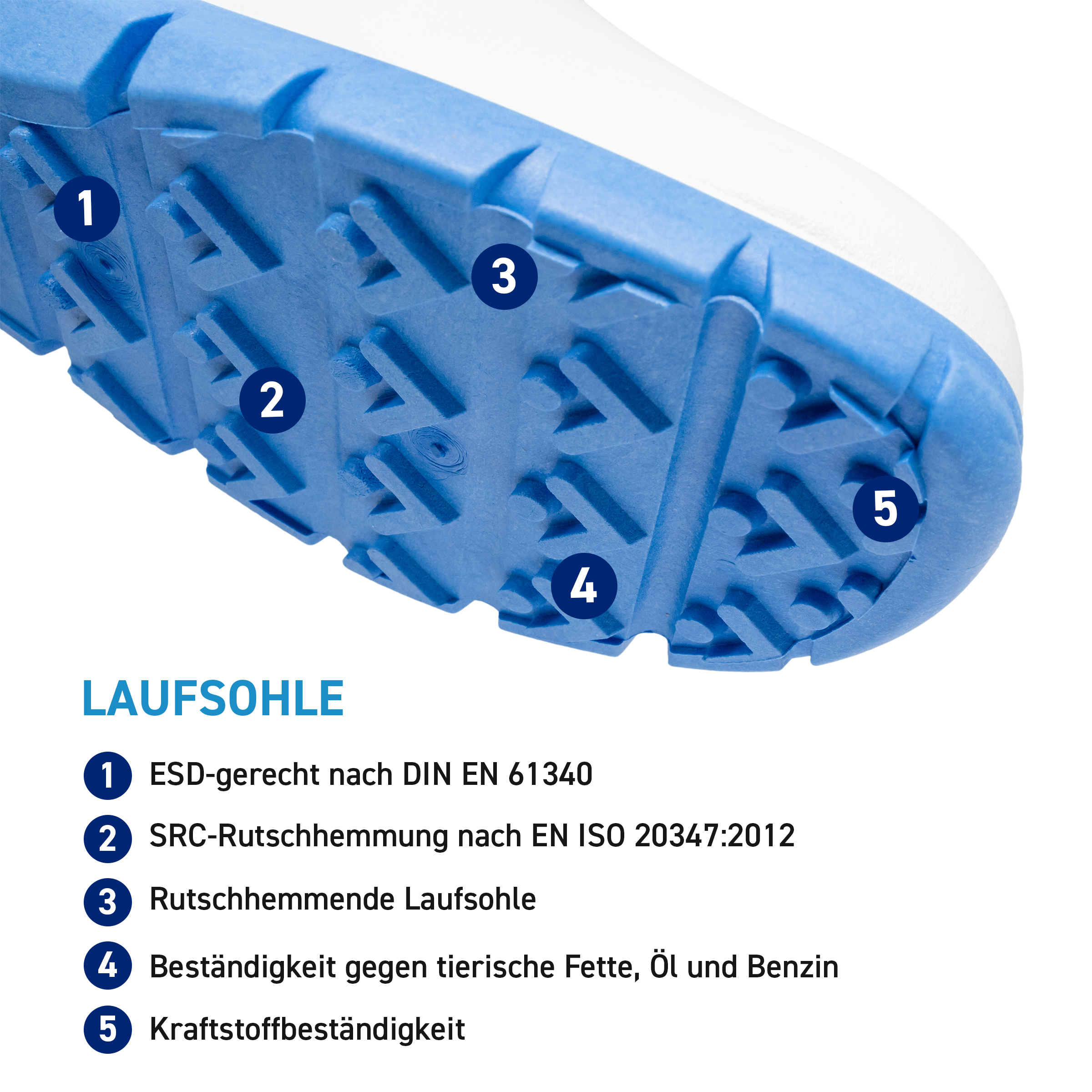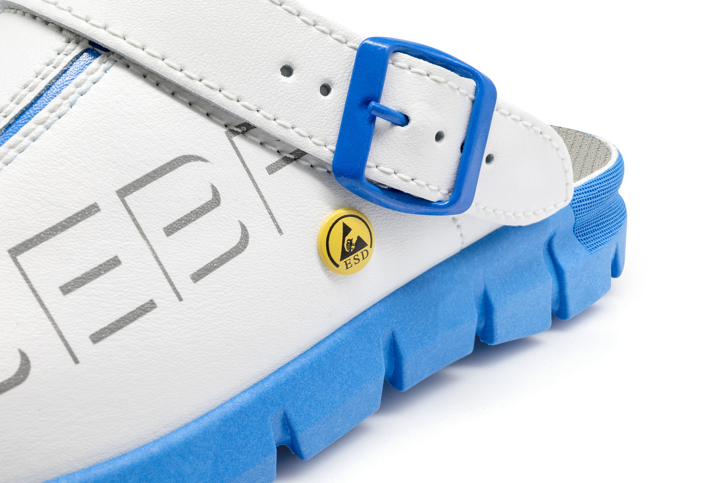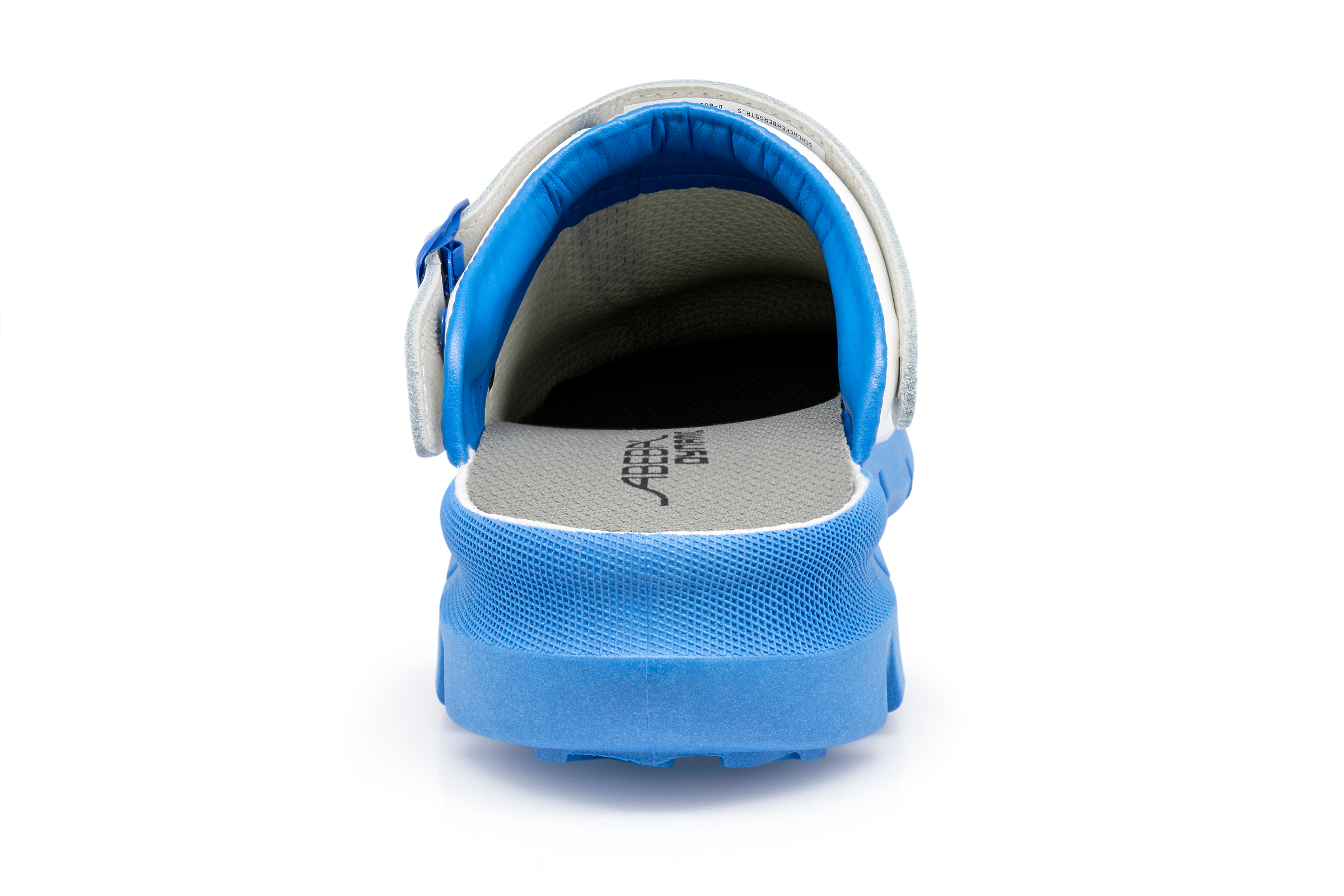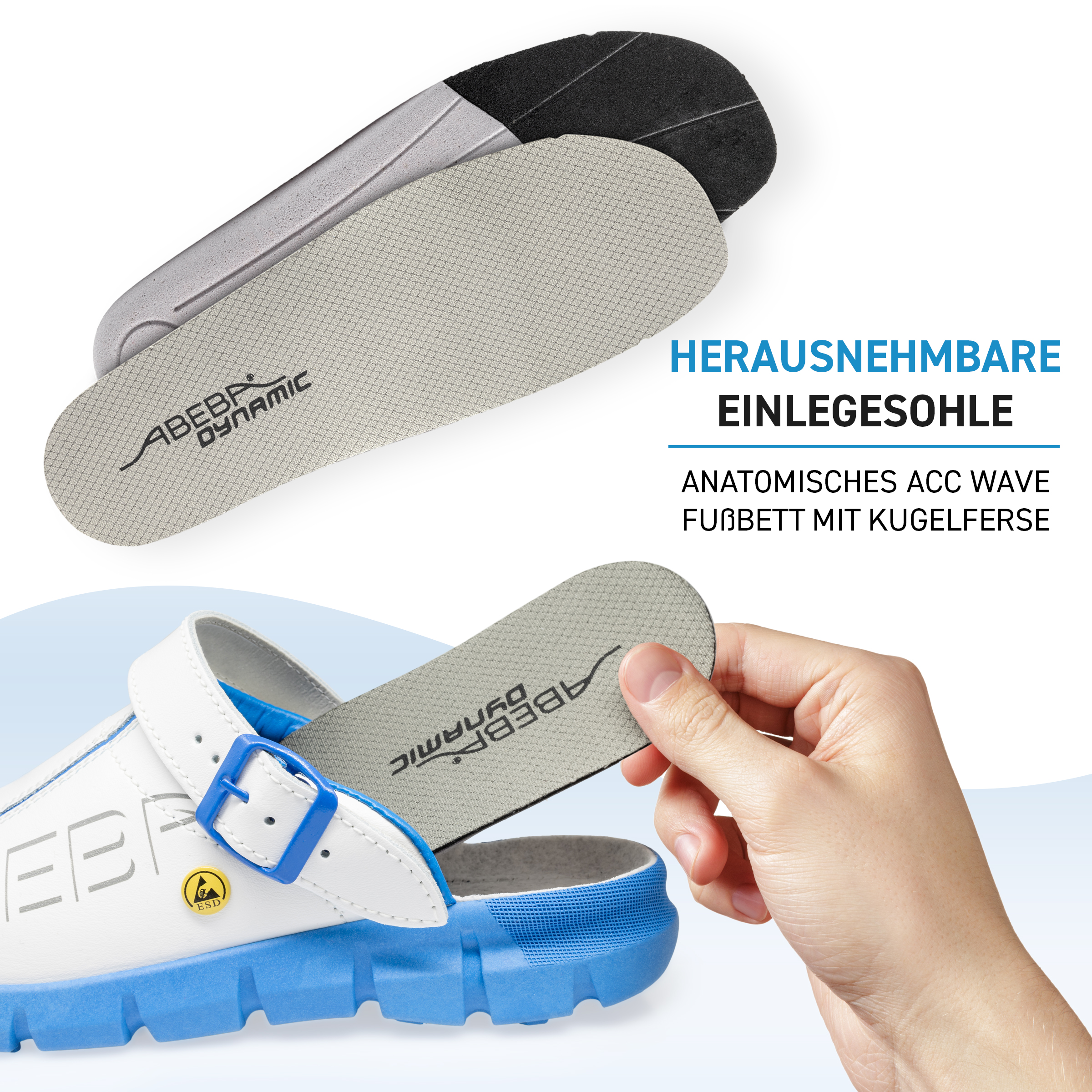 ABEBA ESD-Berufsschuh Dynamic, Clog weiß/ blau mit Aufdruck ESD, ESD-gerecht nach DIN EN 61340, Größe 36, Fersenriemen klappbar, verstellbar, Sicherheitsklasse: OB, auswechselbare acc Wave Einlegesohle (Art. 3574), ORTHOstat Sohle möglich, Sanitized behandelt, Dynamic B ESD Laufsohle blau, Rutschhemmende TPU-Laufsohle, Obermaterial: Glattleder, geeignet für: Damen / Herren, Fersenriemen verstellbar