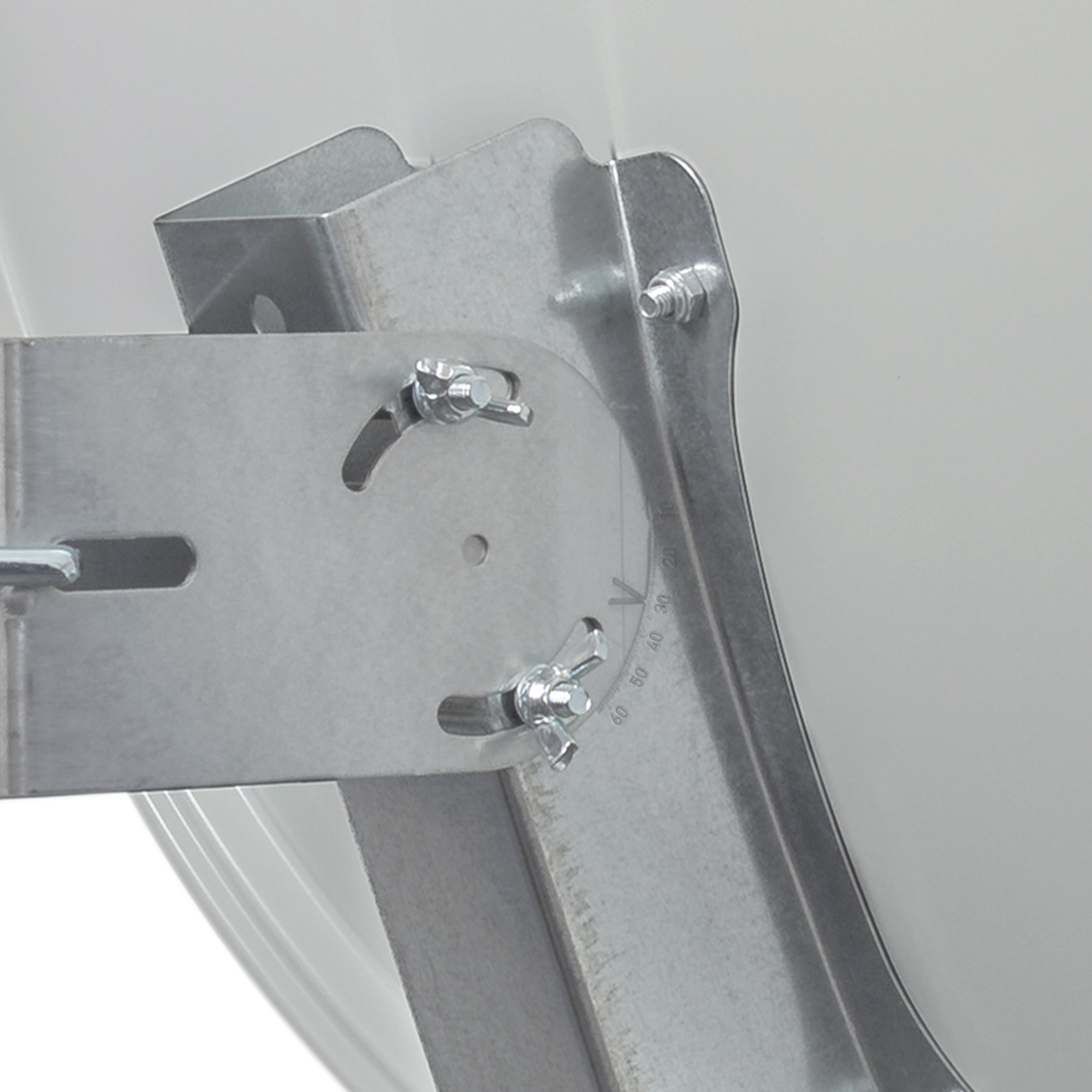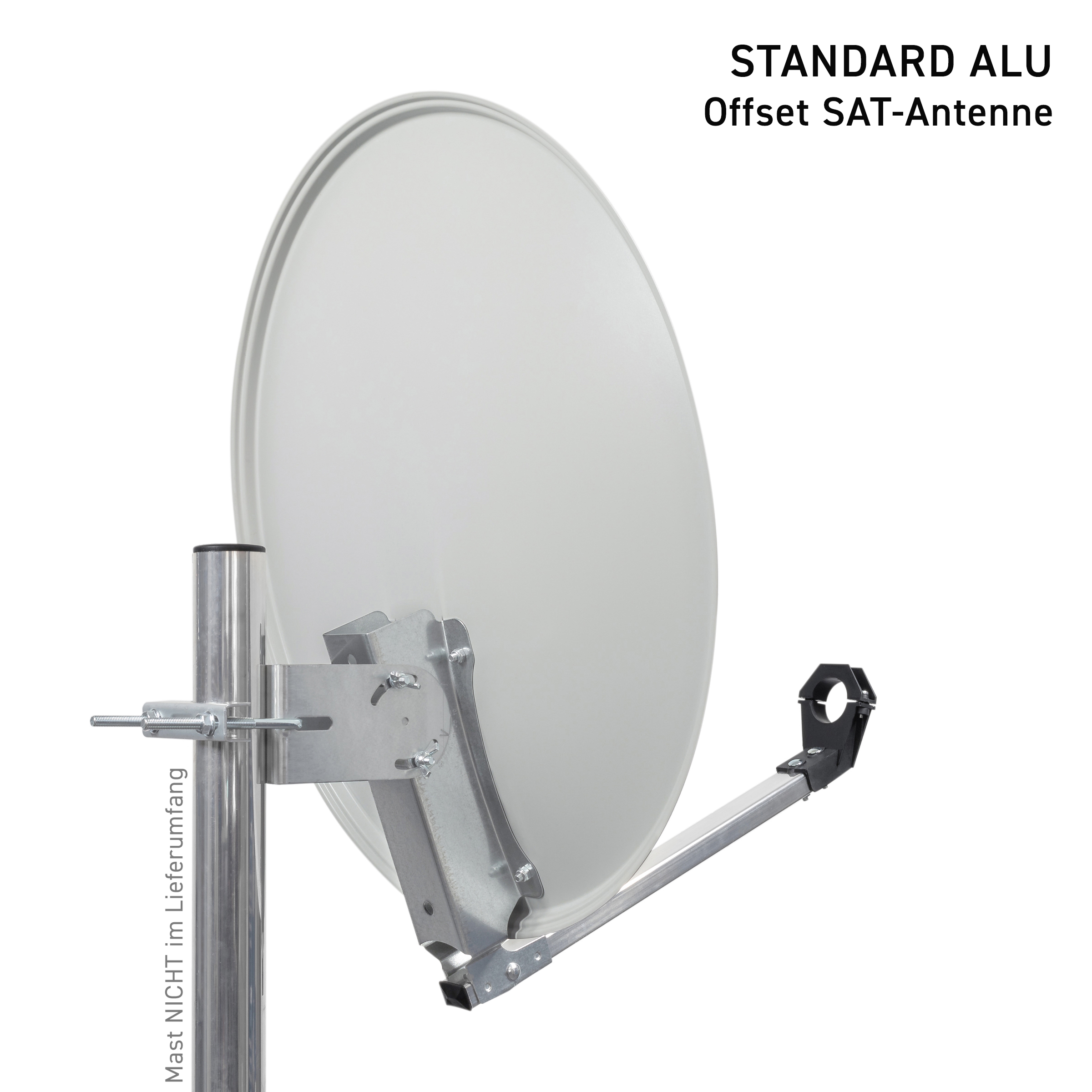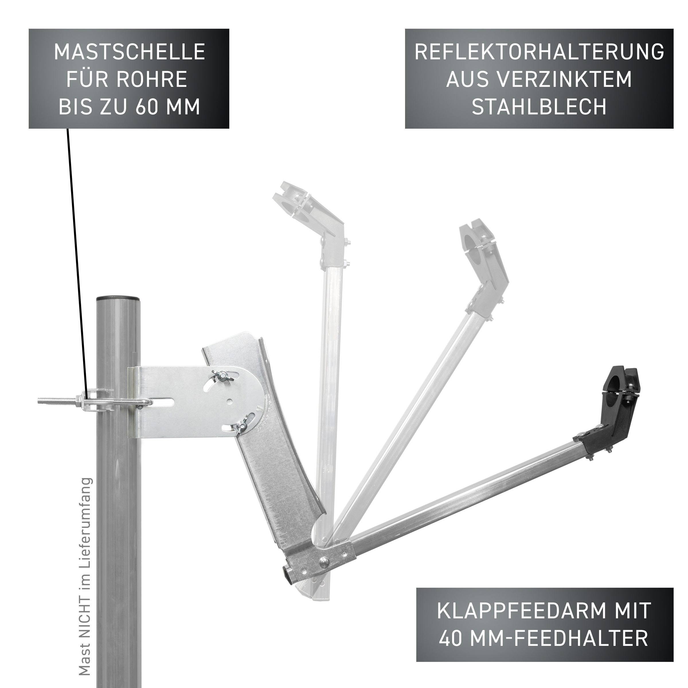 with reflector bracket made of galvanized sheet steel, folding feed arm and plastic feed holder, 1x mast clamp and screw set