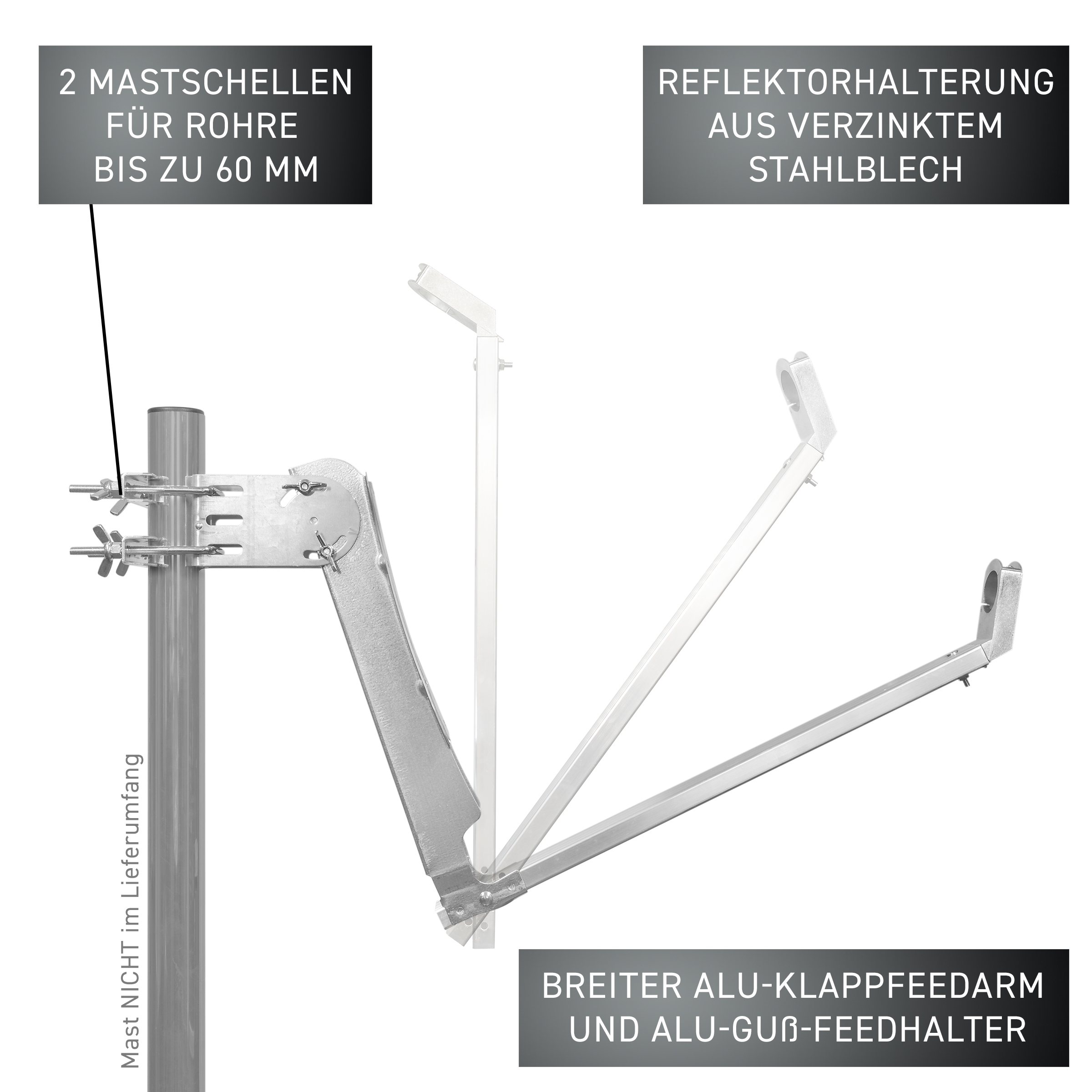 mit Reflektorhalterung aus verzinktem Stahlblech mit breitem ALU-Klappfeedarm und ALU-Guß-Feedhalter, 2x Mastschelle und Flügelschraubensatz