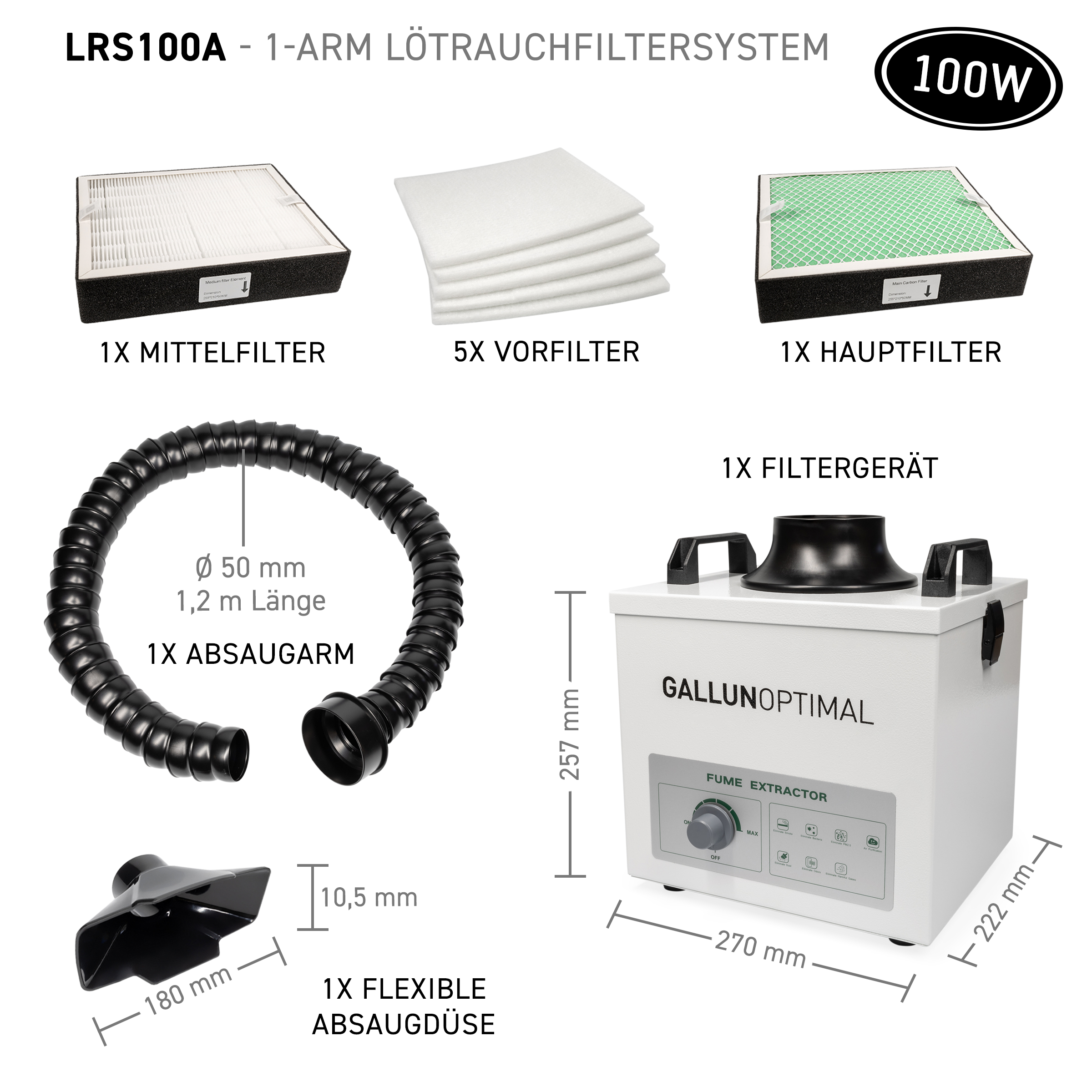 GALLUNOPTIMAL 1-Arm Lötrauchfiltersystem 100W, 200m³/h regelbar, 230V 3-stufiges Filtersystem