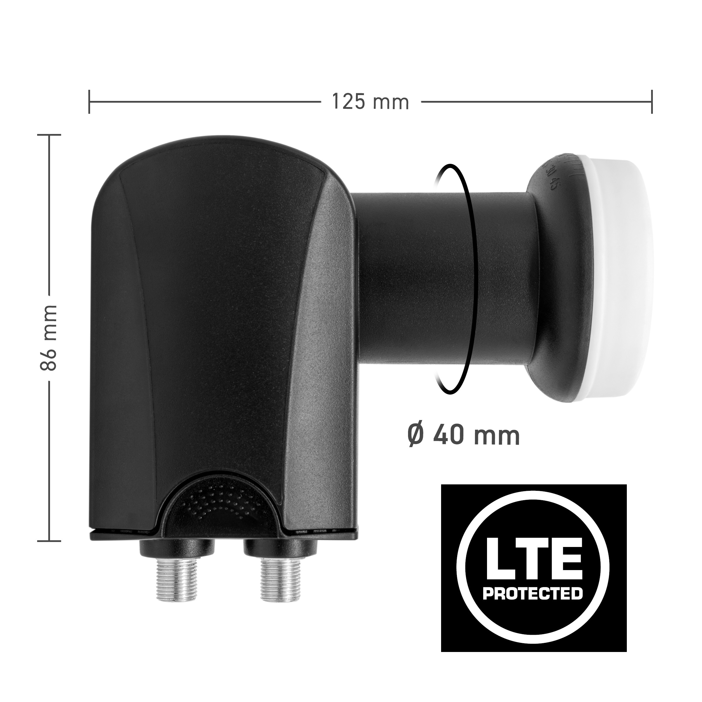 Die Feedaufnahme Ø 40 mm passt in gängige Spiegelhalterungen. Die ausziehbare Wetterschutzkappe schützt beide F-Buchsen vor Feuchtigkeit; zusätzlich ist das LNB mit einem LTE-Filter gegen Störeinflüsse des Mobilfunks geschützt, was potenzielle Beeinflussungen in der Hausverteilung minimiert. Eine Kreuzpolarisations-Entkopplung von 20 dB unterstützt stabile Pegel und niedrige Fehlerraten. Die Versorgung erfolgt bequem über das Koaxkabel (11,5–19 V, typ. 160 mA).