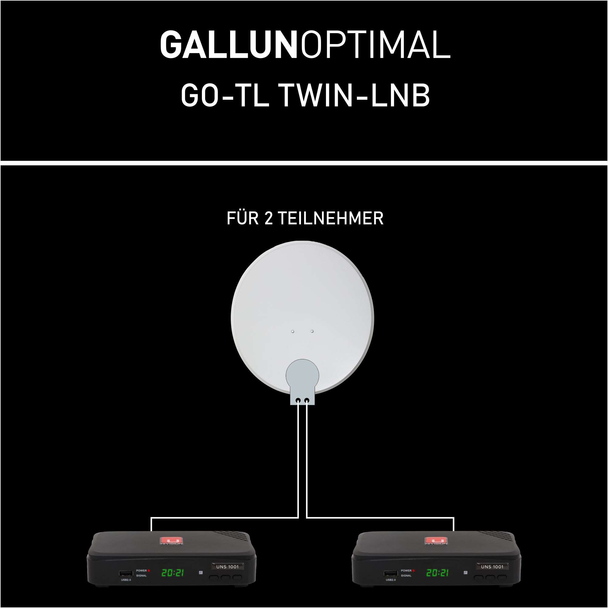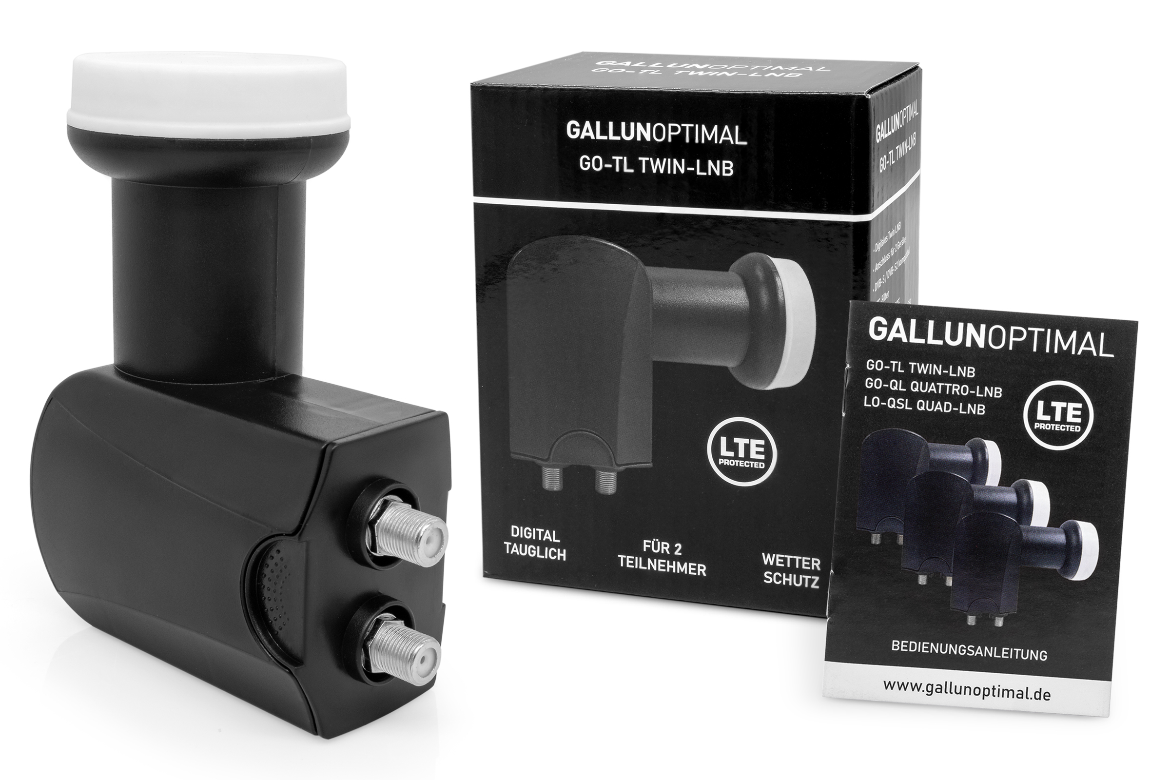 GALLUNOPTIMAL Twin LNB Ø40 mm – 0,1 dB, hoher Gewinn, Satellitenempfang für 2 Teilnehmer, 2×F mit Wetterschutz, LTE-Filter gegen Mobilfunkstörungen, DVB-S/S2, UHD/4K