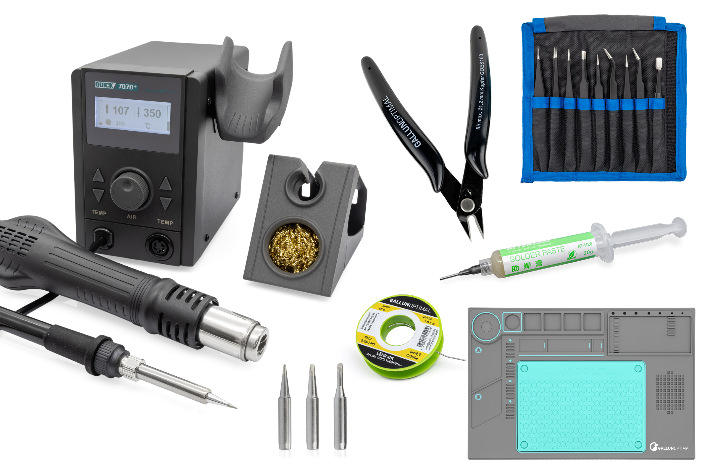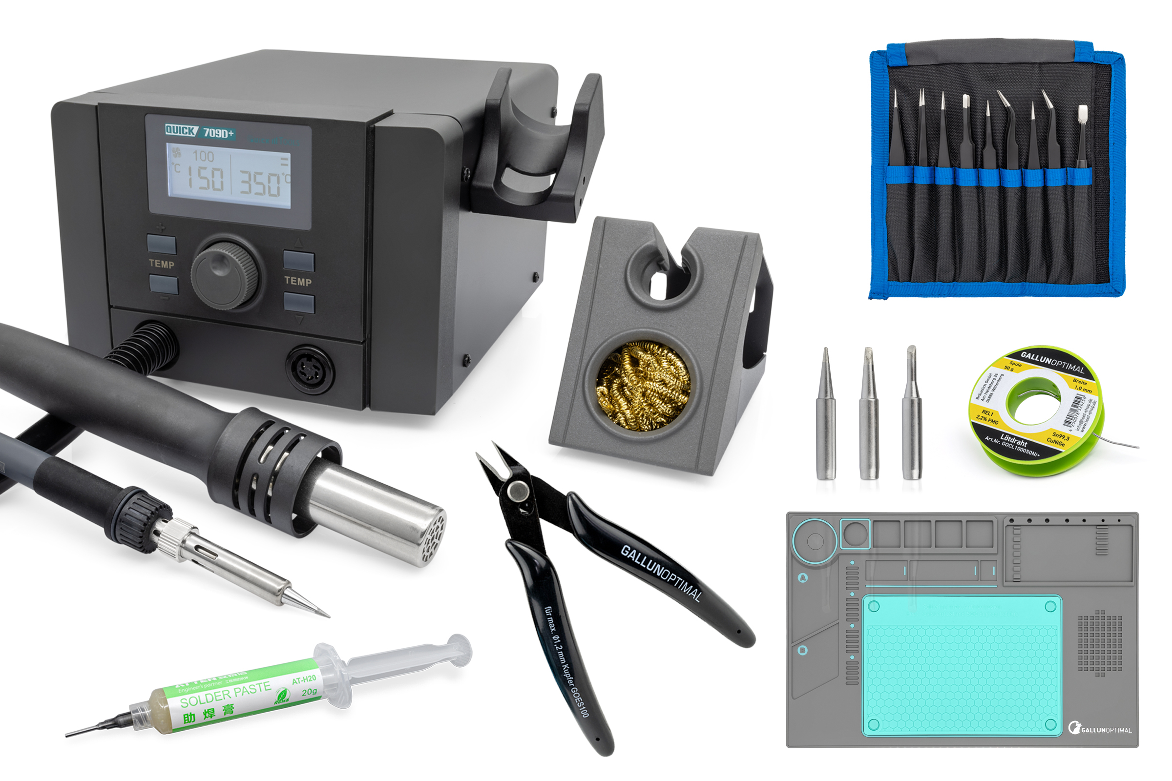 QUICK 707D+ 2in1 Reworkstation digital, 800W Heißluft bis 500°C, 10 stufig max. 30 L/min., 70W Lötstation bis 480°C, Auto-Standby für Heißluft, Kalibrierfunktion, konstante Ausgangstemperatur mit 6-teiligem Zubehör-Set